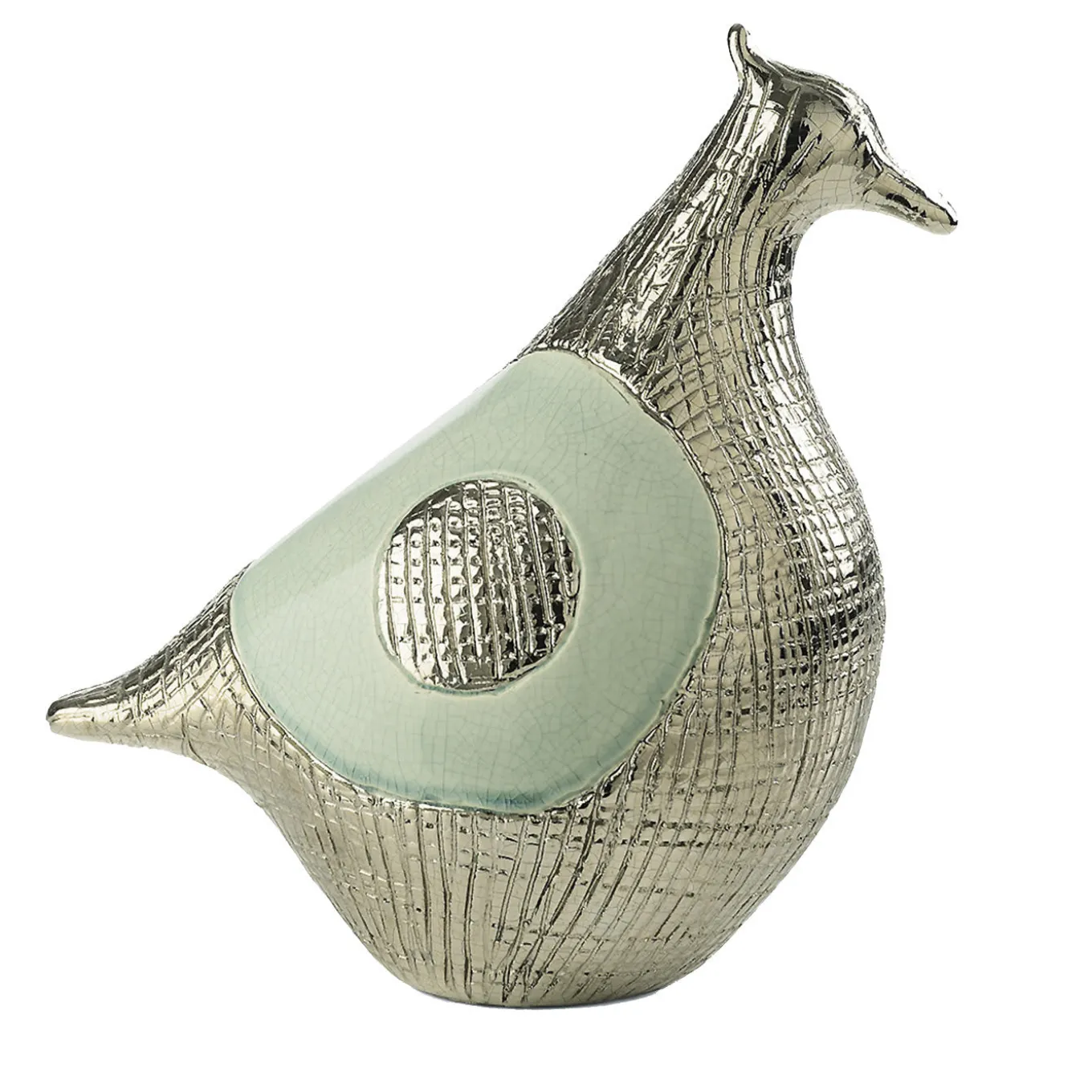 Whimsical and elegant, this stylized statue of a bird merges the allure of classical statuary with modern sophistication. The piece’s refined silhouette and dainty beak, regal crest, and feathered tail are delicately hand-made, fashioned out of ceramic. Sections of smooth, taupe glaze and textured, bronze-colored enamel dance across the surface of the piece, their thoughtful juxtaposition evoking the texture of bird feathers. A wonderful accent in a study or living room, this piece is sure to impress.