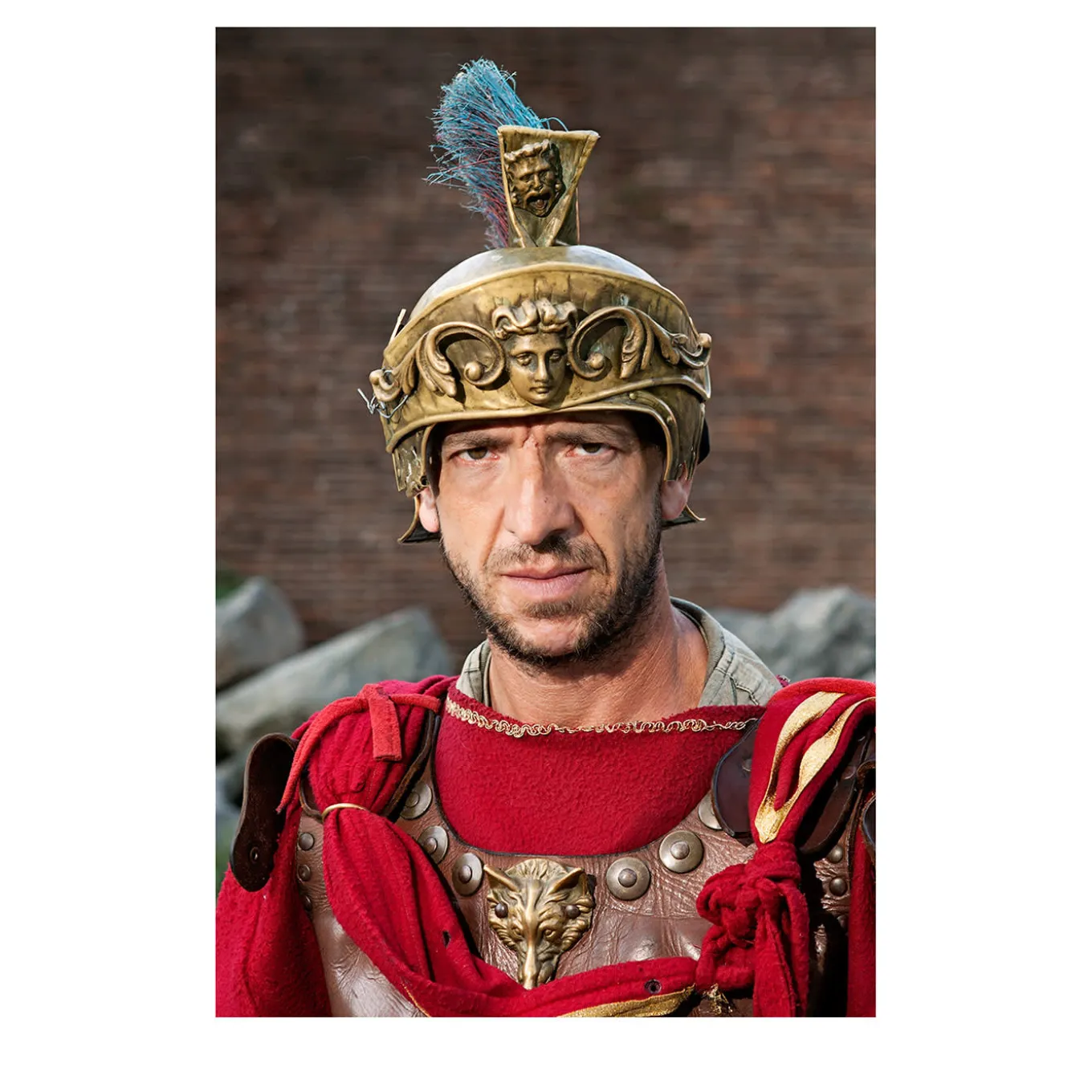 A man dressed as a Roman centurion with an iconic monument behind him is the subject of this photograph, part of a limited series of only 10 pieces. Tourists can take a shot of him for a fee, a mechanism of mutual exploitation photographer Carlo Golia invites to reflect on. Ancient Rome’s glory and history-themed colossals shot in the Roman Studios of Cinecittà are alluded to in these stunning portraits.