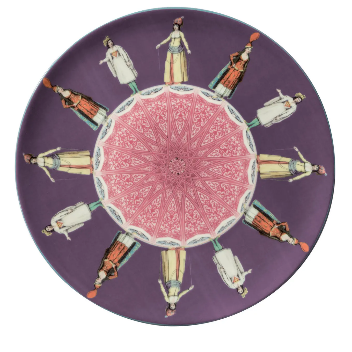 Part of the Constantinopoli collection, inspired by the exotic life in the capital of the Roman/Byzantine Empire, this set of two dessert plates is one of 12 designs made of porcelain. Vito Nesta’s interpretation of the mesmerizing Turkish architecture and of the traditional costumes of the Sultans creates a unique decoration that features an abstract pattern in pink at the center, with a series of stunningly dressed figures over a purple background. This set will make a statement, either to serve small refreshments with tea or combining these two plates with others of the same series.