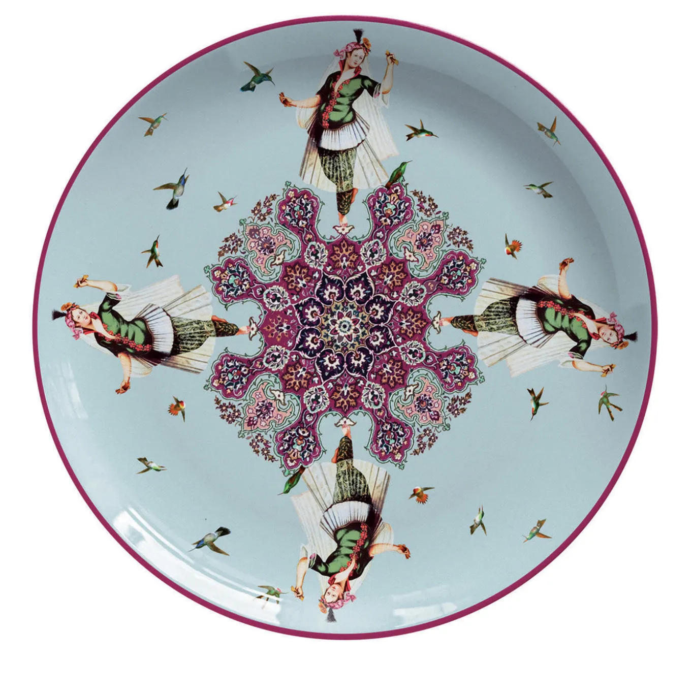 A stunning and refined addition to any home, this unique set comprises two dessert plates that will add a colorful touch and a delicate sense of movement to any table. The set was crafted of porcelain and is part of the Costantinopoli collection, inspired by the mysterious and exotic allure of the old capital of the Byzantine Empire and comprising 12 designs that can be combined together. This one features a charming pale-blue background enlivened with colorful hummingbirds that fly around four women dancing on an abstract central decoration.