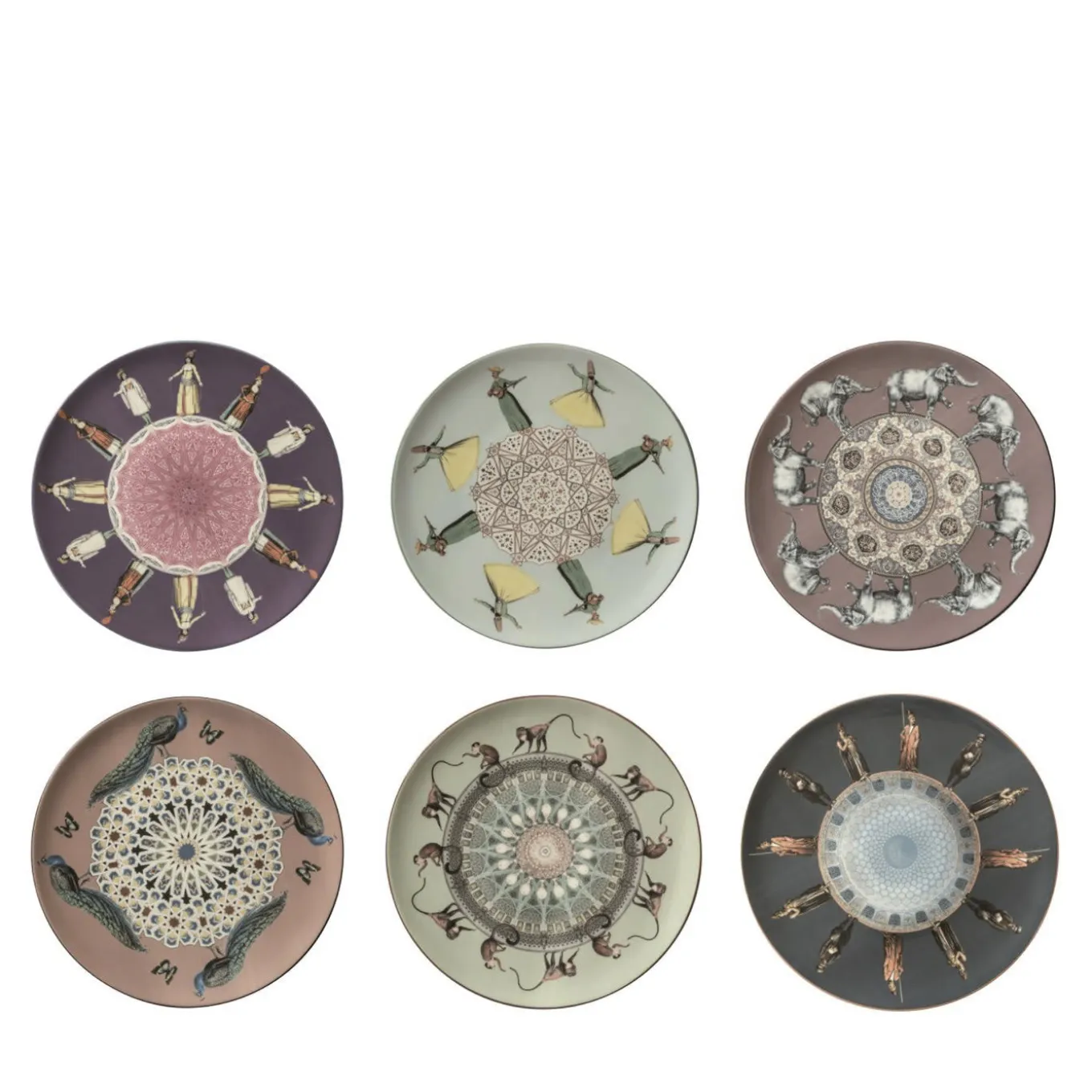 Rich details, delicate color combinations, and striking contrasts of abstract and naturalistic decorations make this set of six dessert plates a magnificent addition to any decor. Either as a special accent for a personal collection, or a well received housewarming gift, this set will add a lavish touch to any occasion. Each design boasts a different interpretation of the Constantinople architecture combined with exotic fauna and figures dressed in traditional Turkish clothes.