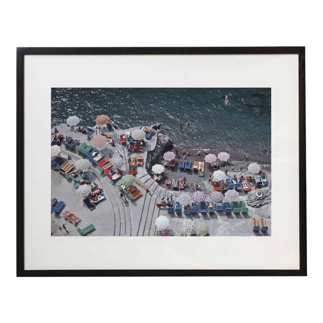 Vibrant reproduction of the original shot by Slim Aarons in 1979, this high-quality, C-type photografic print guarantees continuous tone and high definition. Colorful umbrellas and light-hearted sunbathers are captured from an elevated view while lounging on the cemented beach of La Scogliera in Positano, the “wedding cake” gem of the Amalfi Coast. The print meaures 51×76 cm and comes with a wooden frame. Prints from the Slim Aarons Archive, owned and housed by Getty Images. All photographs are printed and authorised by the Getty Images Gallery, London. Accompanied by certificate of authenticity.
