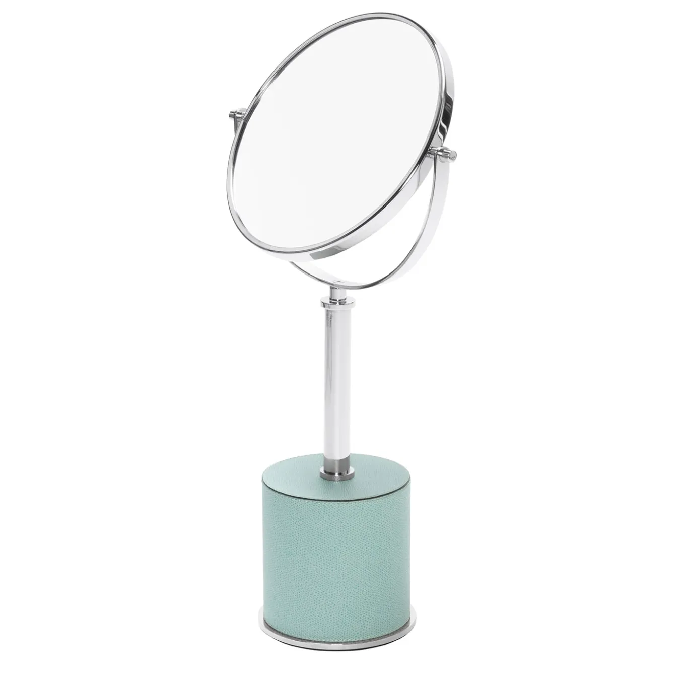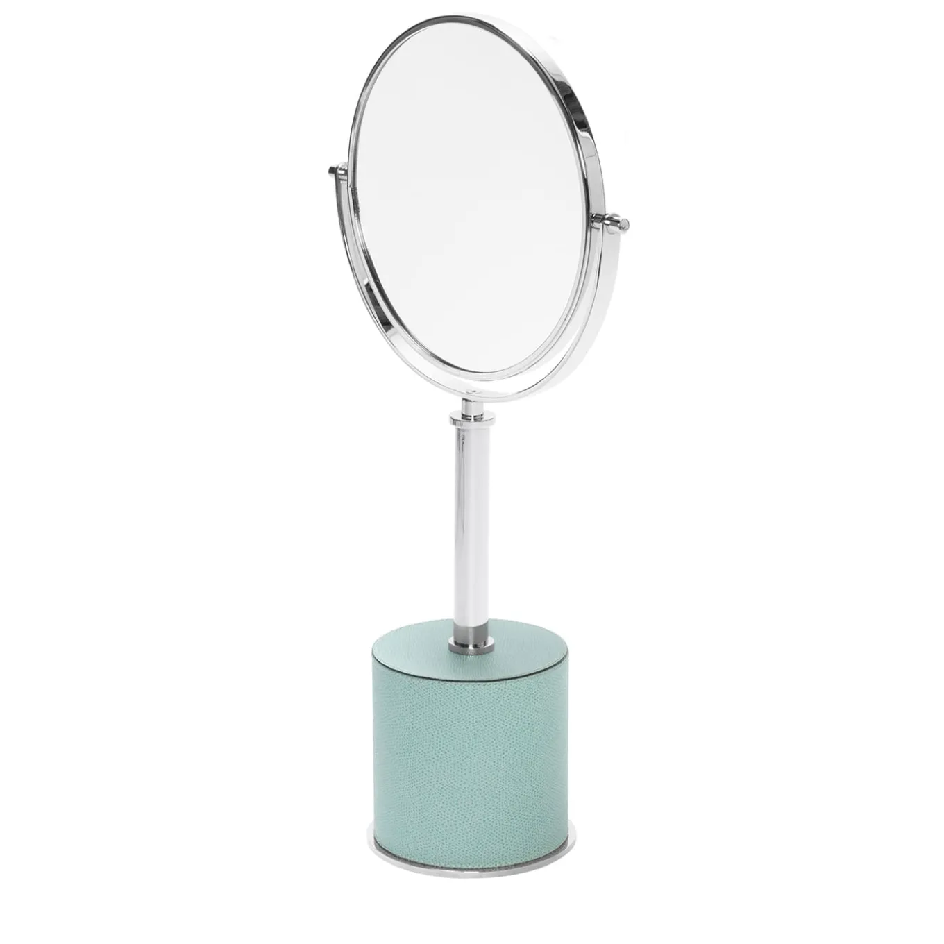 Metal structure available in different finishes featuring a heavy leather-covered base that grants perfect stability. The mirror rotates for a choice of 2x magnification or standard reflection. Metal finishes available: chrome / bronze / brass.