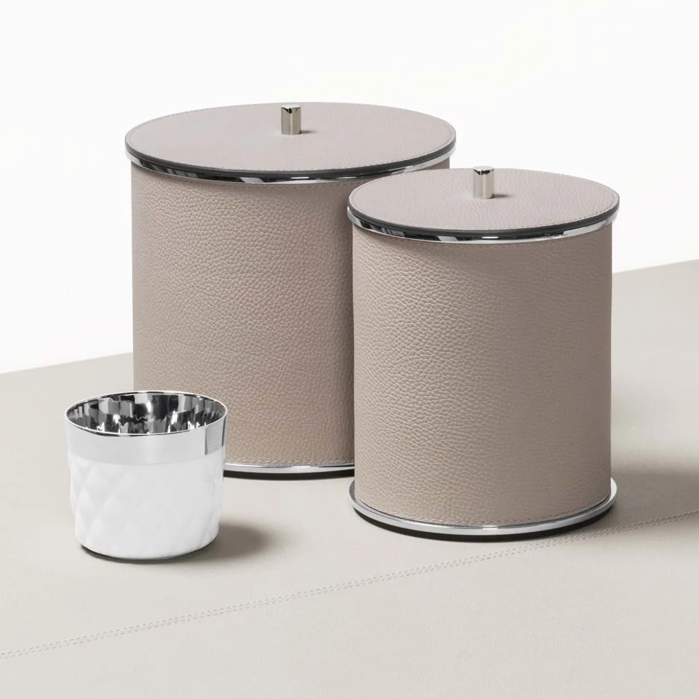 Elegant and refined, this ice bucket is fashioned of high quality materials. Upholstered with fine white leather, the piece features an insulated double-chamber structure made of brass and steel, and is enriched with an elegant lid.