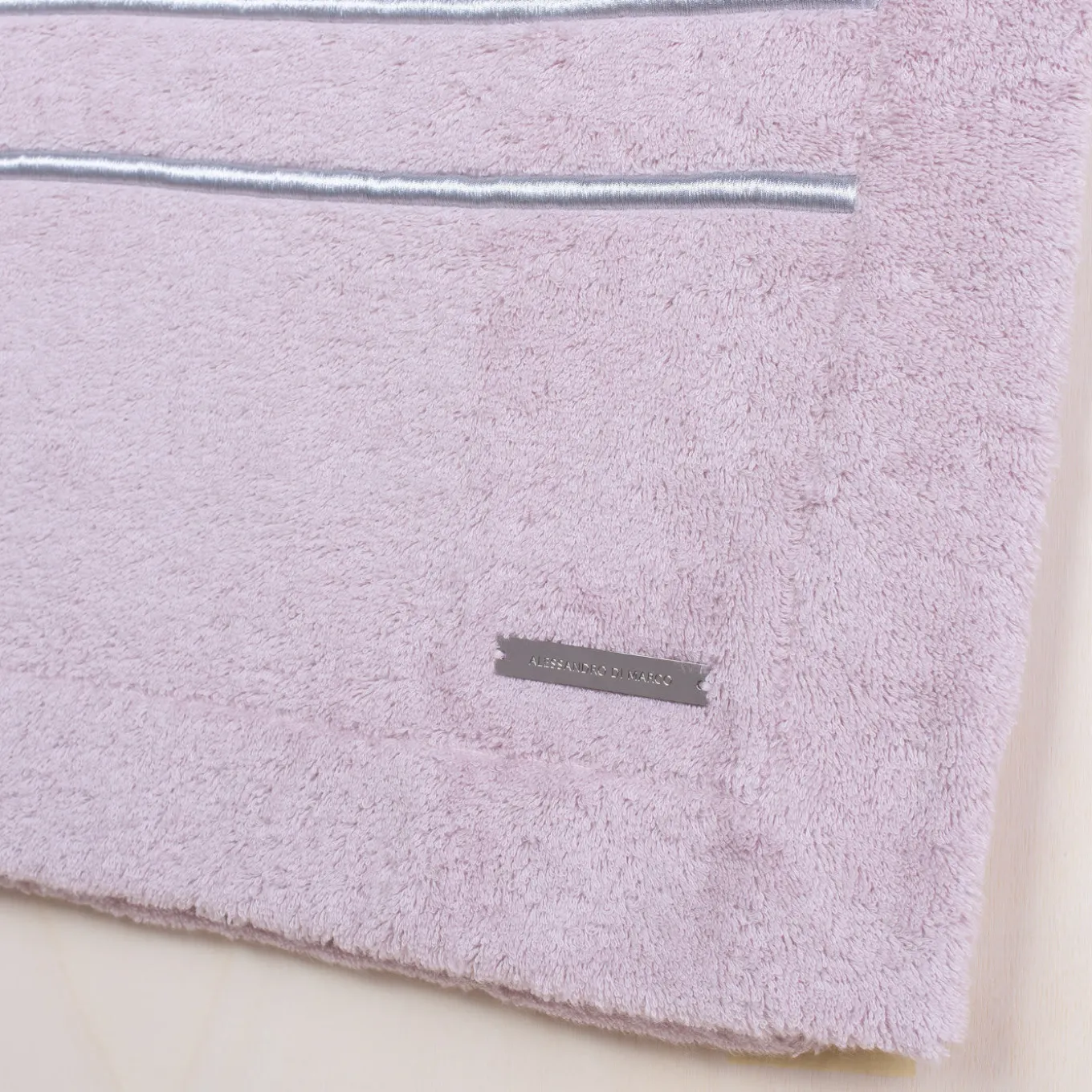 This elegant beach towel in powder pink is crafted in Egyptian cotton of the finest quality, accented by five silver embroideries in Lurex yarn that run across its surface. The metal logo plate has been embossed and sports a palladium finish.