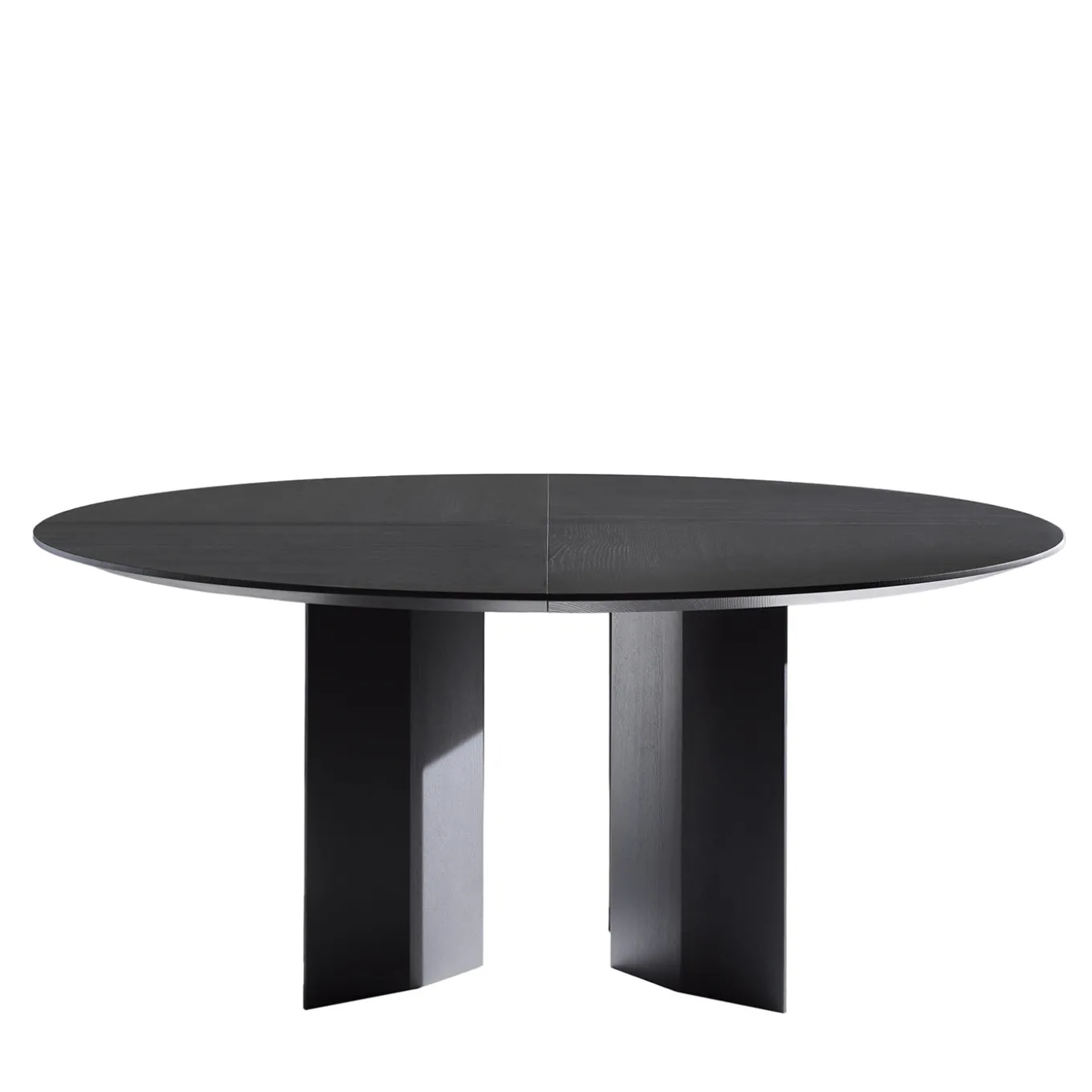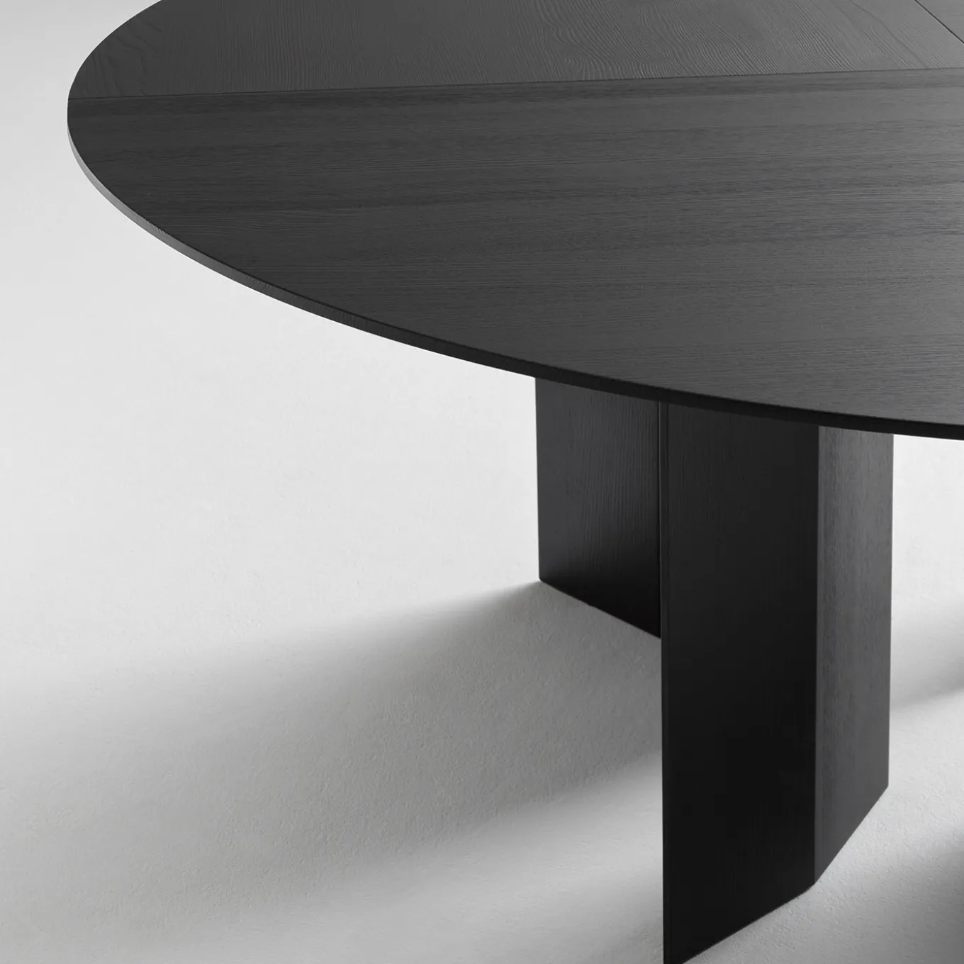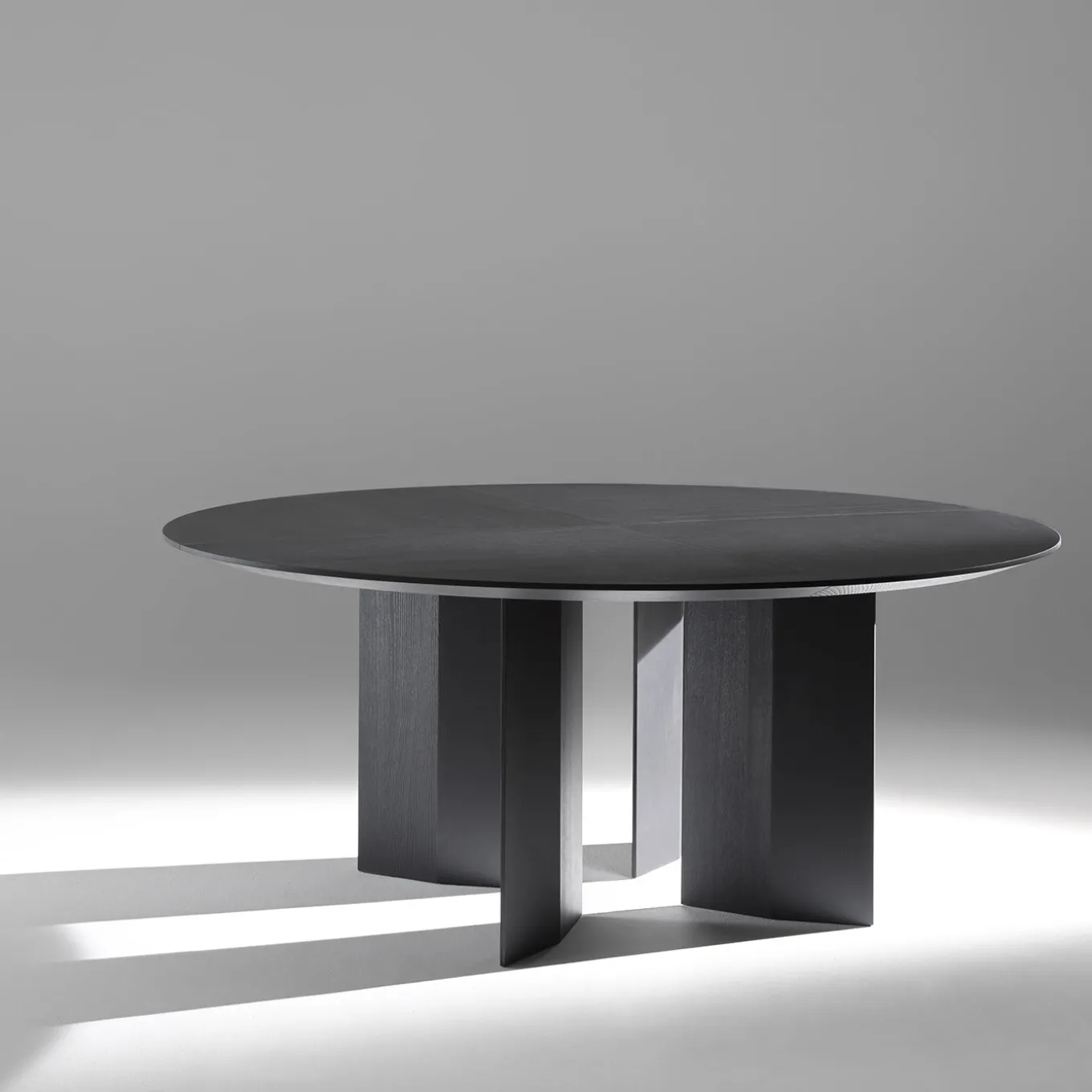 This sleek dining table features a spacious round top designed for comfortable dining experiences. Its surface is divided into four detachable sections, enabling easy transport and assembly. Supported by sturdy, geometric legs, this medium-large table combines minimalist design with practical functionality, making it a versatile centerpiece suitable for various dining spaces.