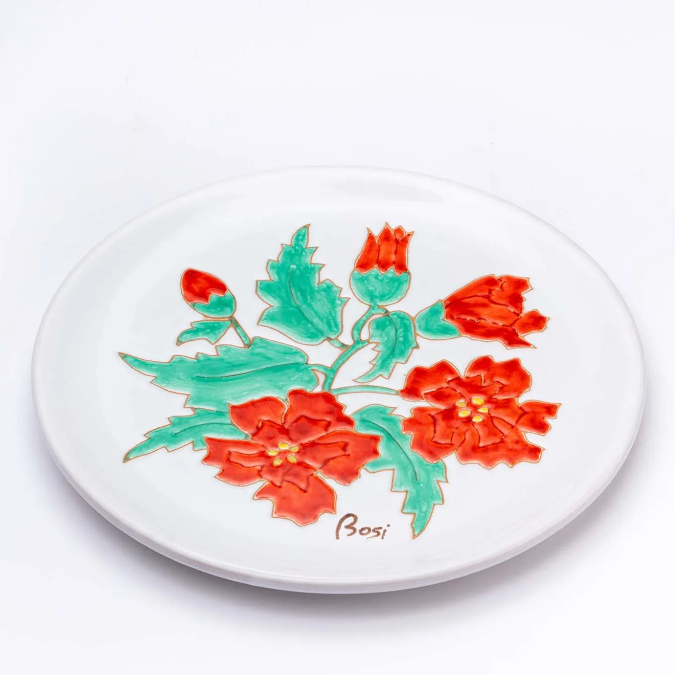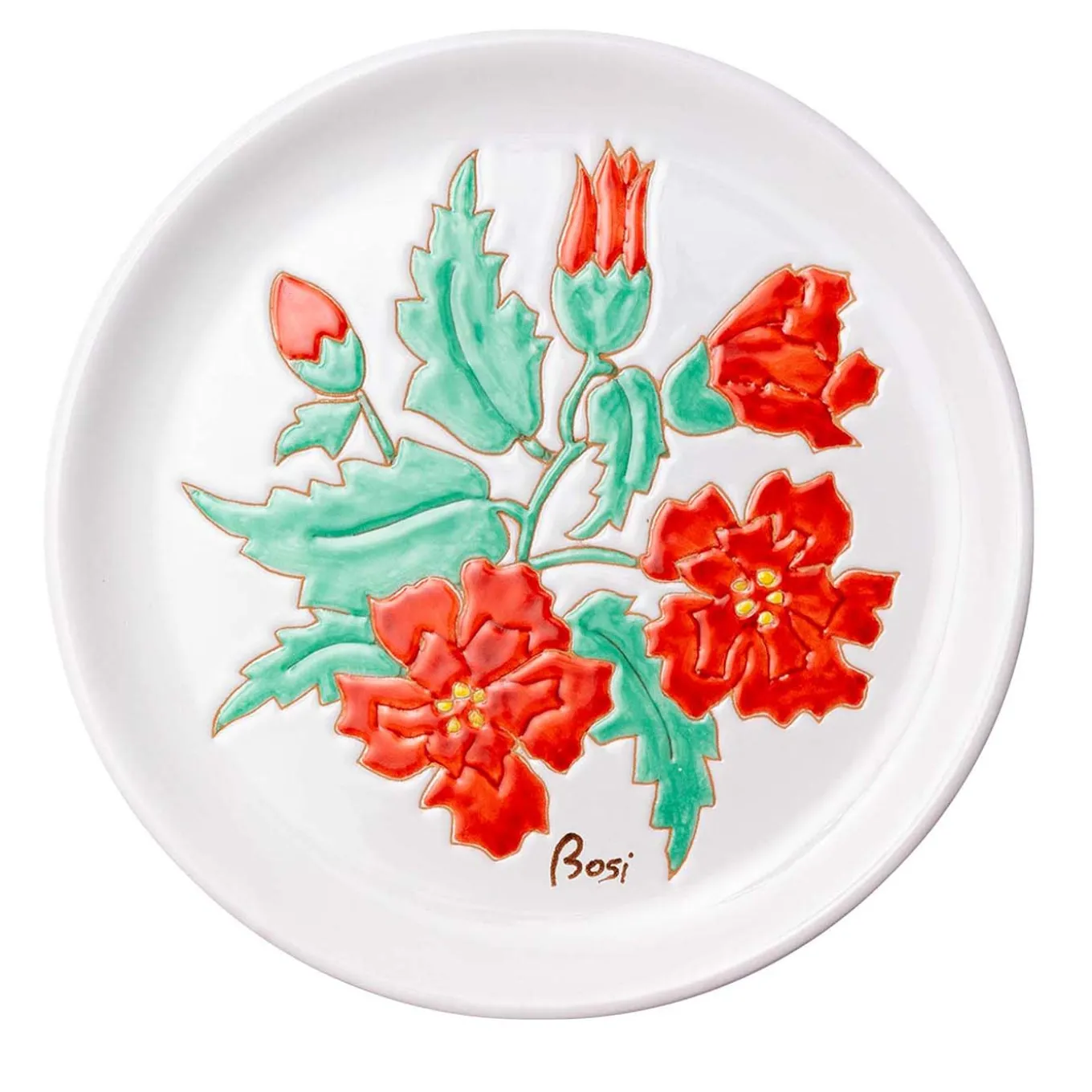Nature’s rebirth during springtime inspired the lush floral decoration deftly engraved by hand on this decorative plate. Fashioned of top-quality ceramic, it boasts foliage and flower buds painstakingly painted in green and vibrant red, respectively, an ensemble capable of conveying the charm of blossoming gardens. It will seduce with its artistic potential either raised on a pedestal base or hung on walls.