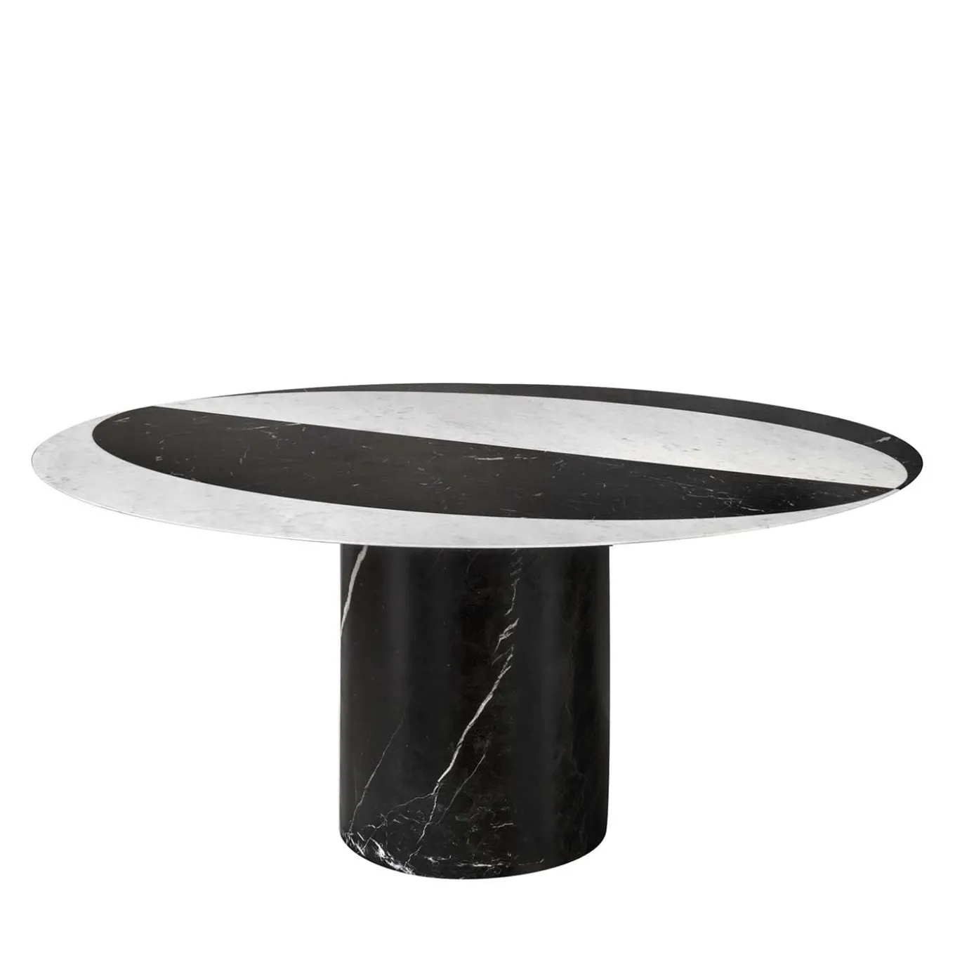 Part of the Proiezioni collection, this contemporary dining table merges sculpture with design for a strikingly elegant silhouette. Supported by an imposing pillar base of black Marquina marble, the round top stands out for its inlay pattern of white Carrara and black Marquina semicircles that evoke the image of light reflections on the surface. The dramatic interplay of colors and textures of the two marbles results in a graphic contrast that will add dramatic flair to any living room decor.