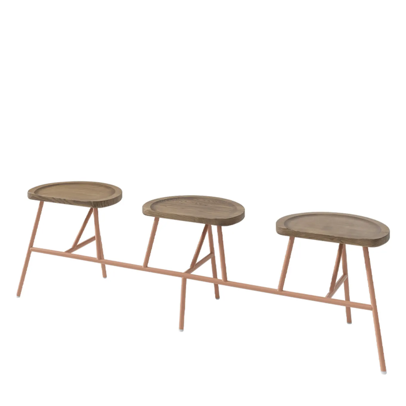 Conveying a sense of lightness and effortless charm, this exclusive design by Emilio Nanni draws inspiration from the stool and reinterprets it in multiple iterations that complement both commercial and residential decors. The cylindrical steel frame lacquered in a light-tobacco hue gracefully sustains the three separate seats, each in a semi-circular shape and crafted of ash tinted in mahogany brown.