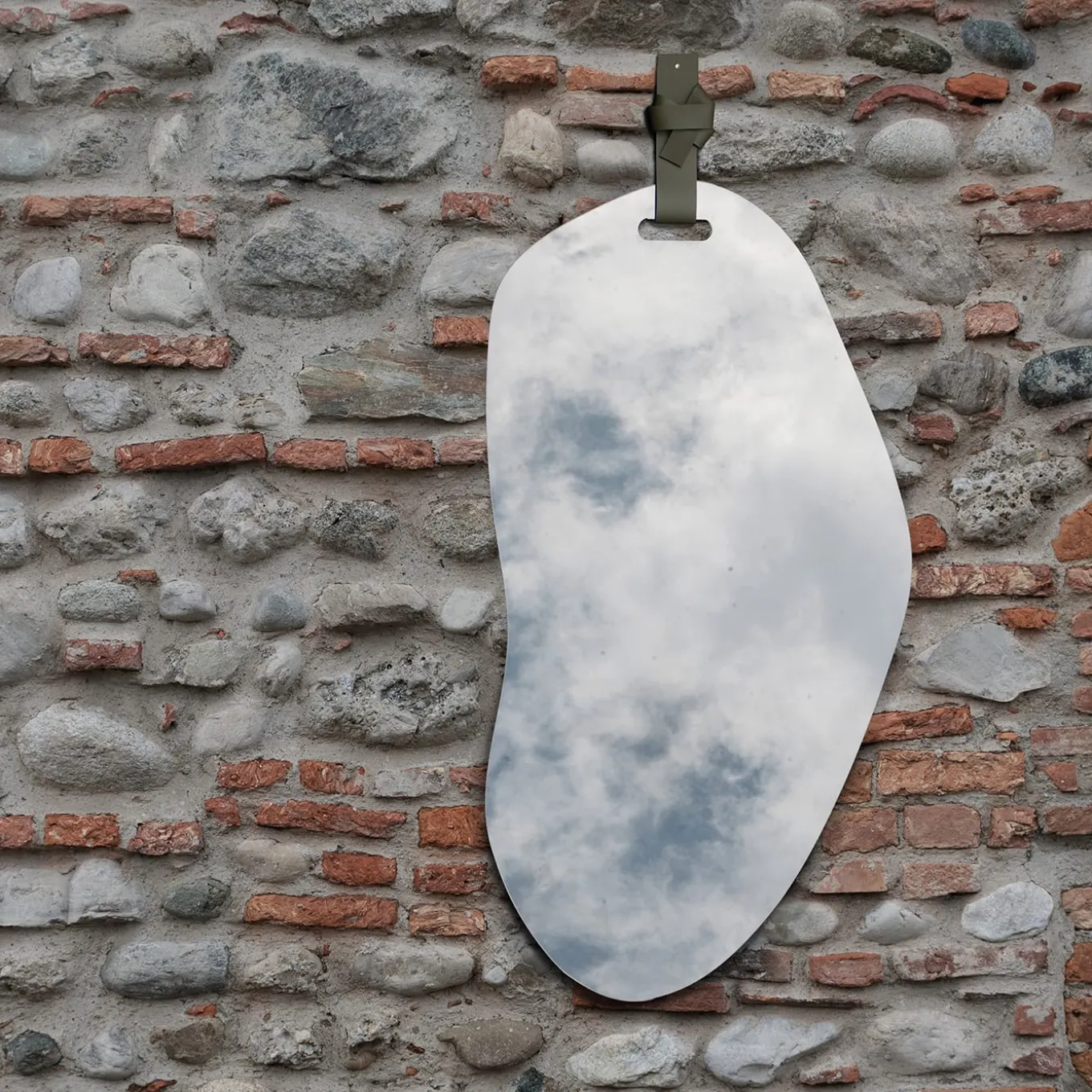 The leather knot, symbolizing the cohesion between the external and internal environment, seamlessly blends with the organic shapes of the mirror, transforming it into a decorative wall piece with fluid forms. Available in three different shapes and sizes, this vertical and larger model, can also be customized with a smooth surface without the hole, catering to individual preferences. Also available in other finishes, please contact the Concierge for more details.