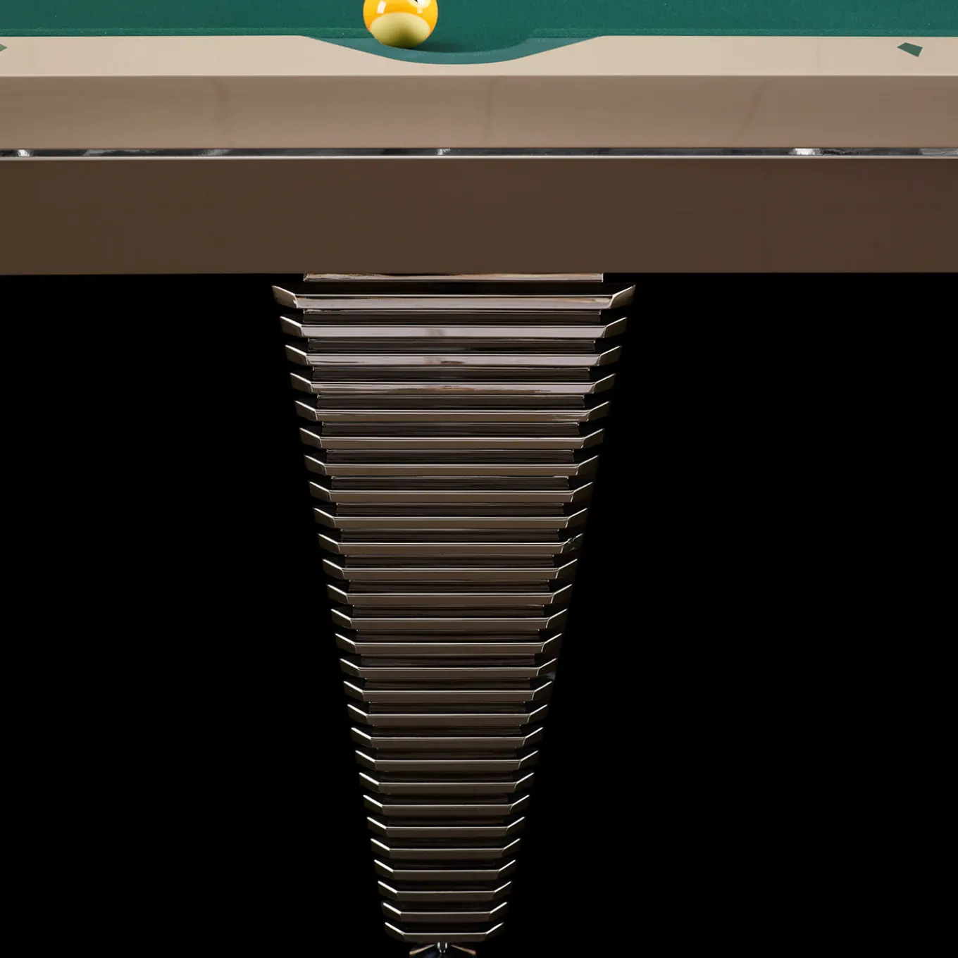 This elegant and prestigious billiard table of the Exclusive collection designed by Cavicchi is characterized by 6 distinctive pyramid-shaped full-bodied bases in polished metal chrome and a dark green top with leather pockets and rhomboidal-shaped ball points in dark green lacquer. This unique table features a 9ft playing surface and an original 100% made in Italy slate.