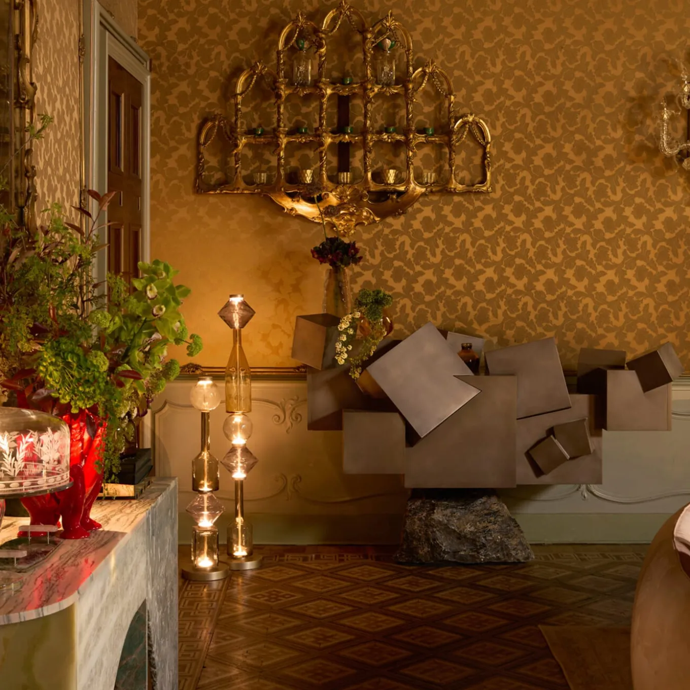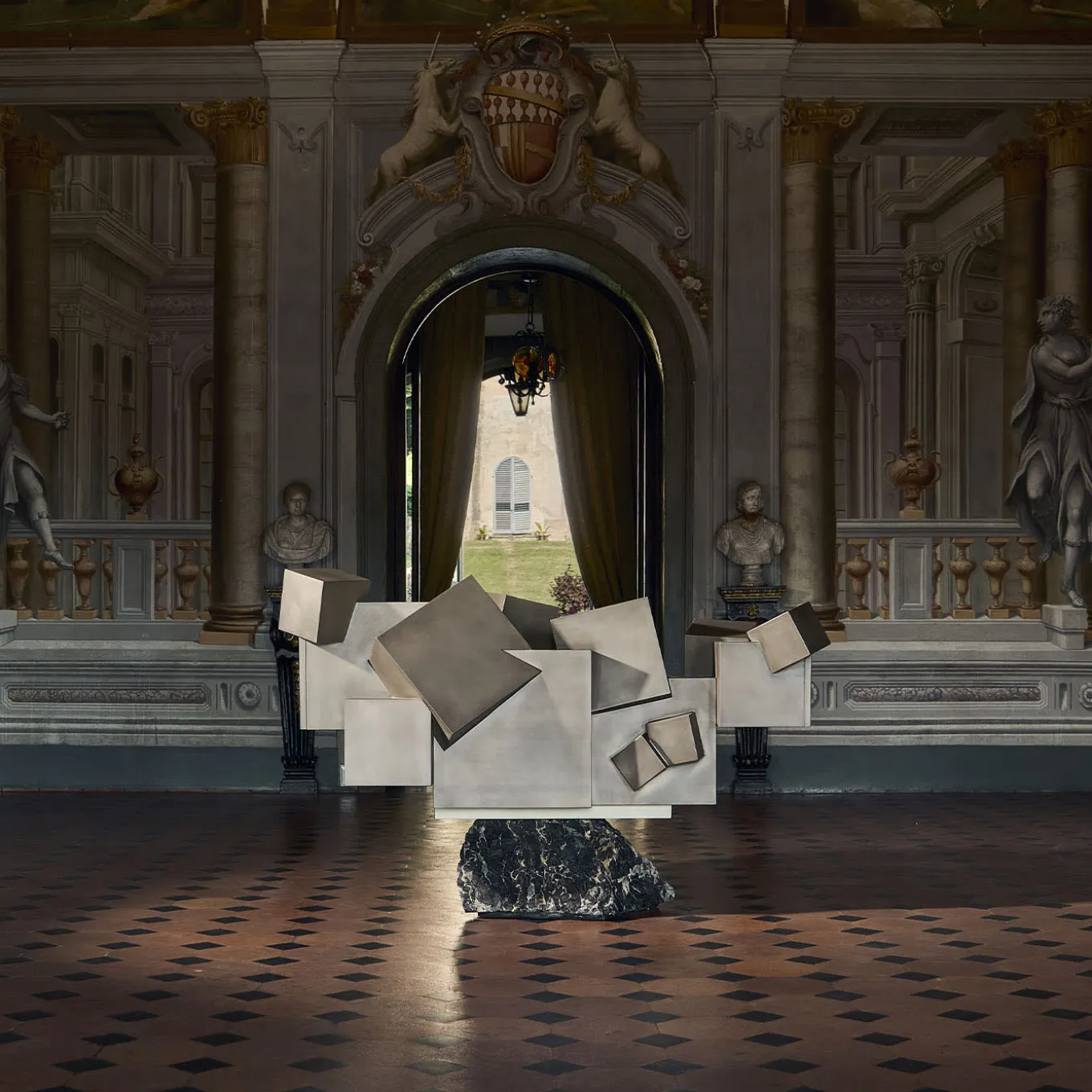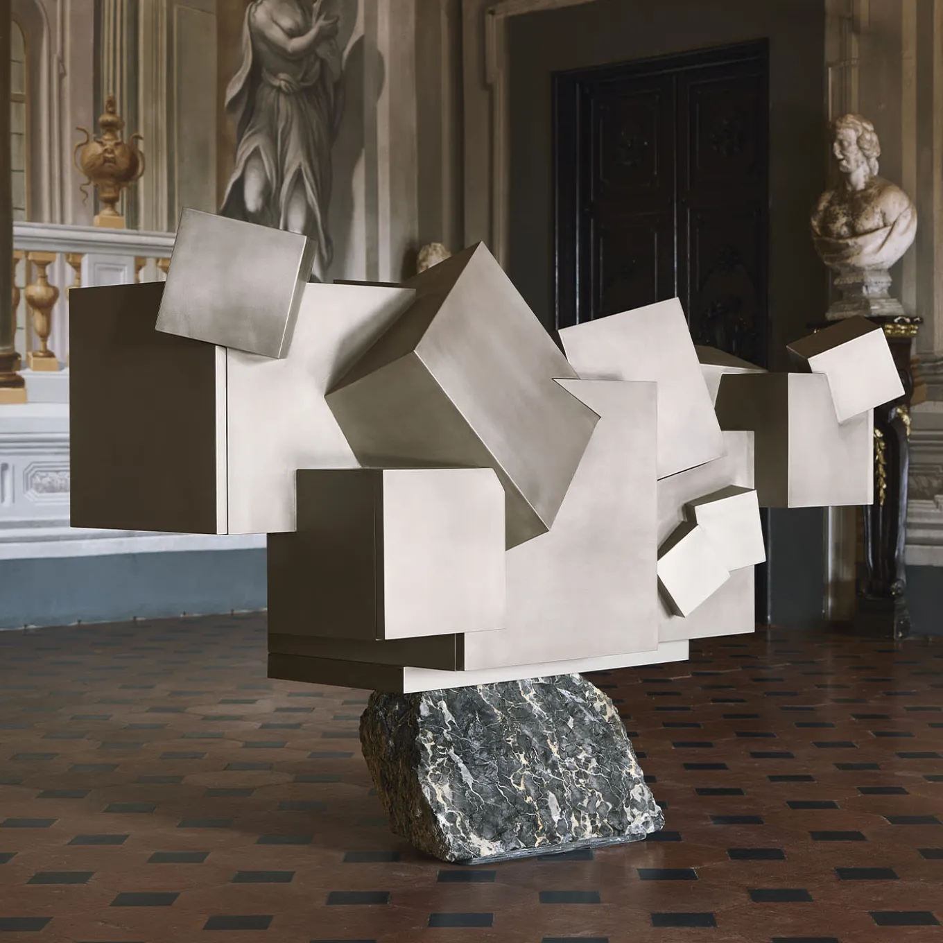 From the greek pyr, the pyrite mineral is the inspiration for this cabinet. This mineral presents itself as a cuboid crystalline structure and is represented in the piece through an assembly of cubic containers. The cabinet openings are of different sizes opened in two ways: the three front doors can be tilted whilst the two side doors are hinged. The wooden structure is coated with a metal-based paint. The base in Portoro marble can also be remove and the cabinet suspended from the wall.
