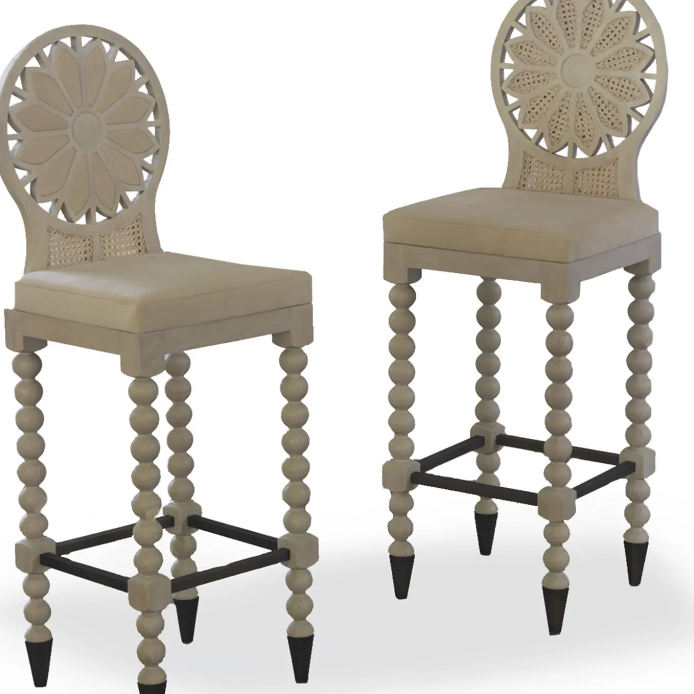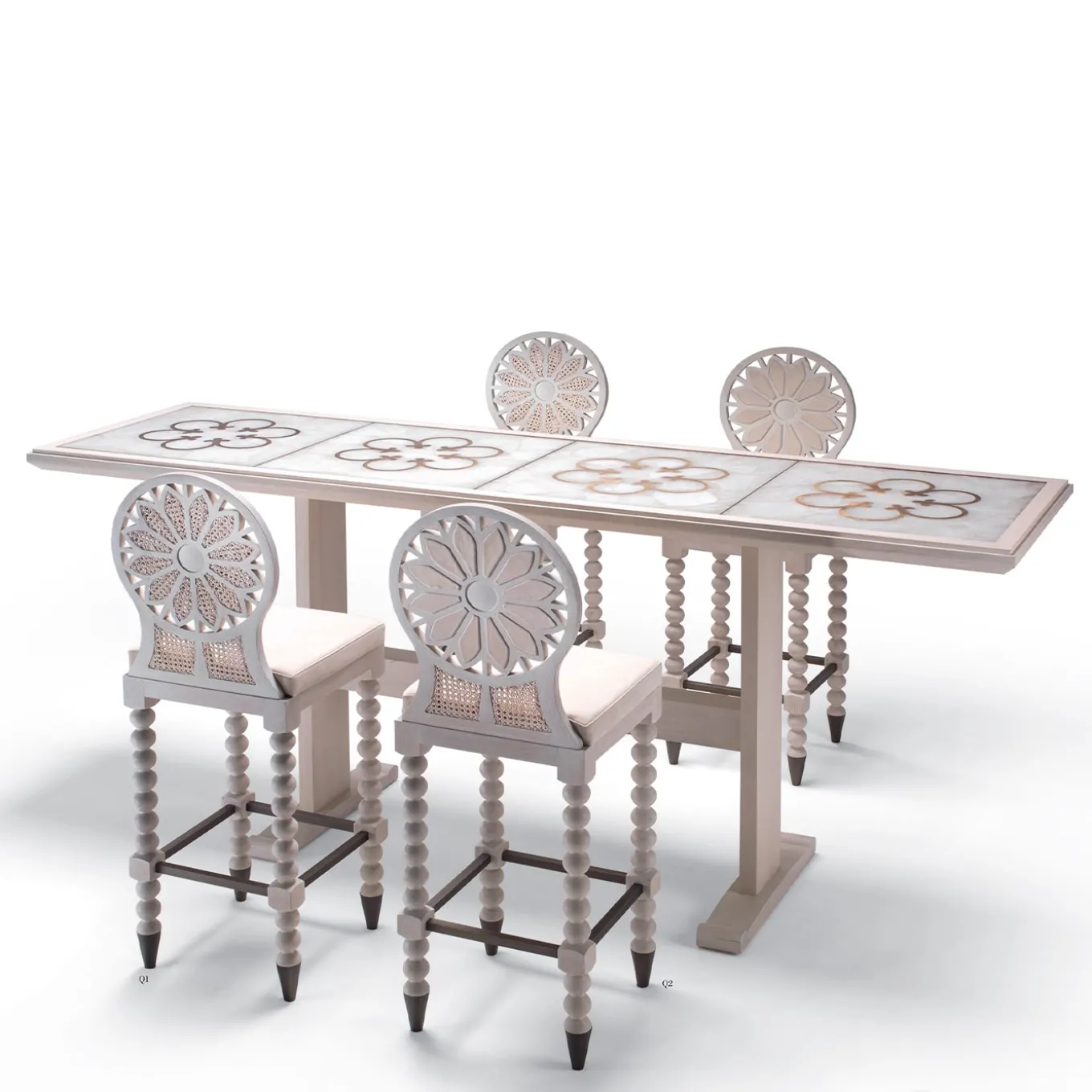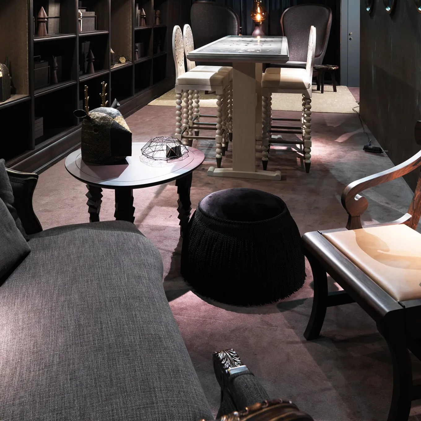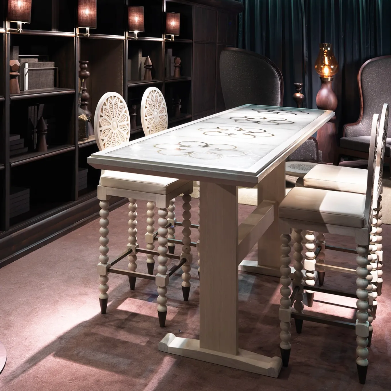 In the elegant bleached oak finish, this stool stands out with its distinctive inlaid legs, a composition of spheres delicately balanced atop one another. The seat cushion, cloaked in delicate nabuck leather, ensures both comfort and luxury. What truly sets the Q2 apart is its meticulously sculpted openwork panel on the back. This intricate floral decorative theme, with some slices covered with leather, lightens the silhouette, creating a mesmerizing interplay of light and shadow.