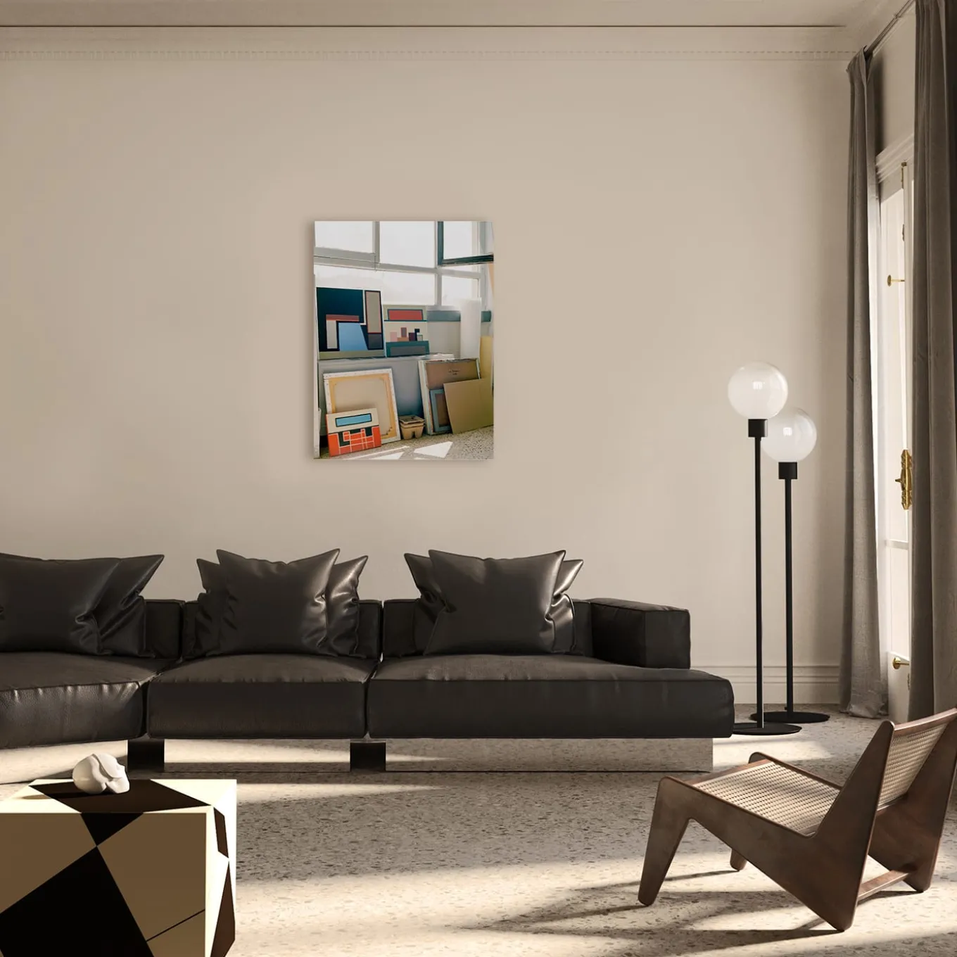 An array of paintings gathered near an open window are the subject of the 2019 photo taken in Natalie Du Pasquier’s Milan-based art studio and printed on this fine C-type print. An expert photographic pressman working under the artist’s supervision takes care of the entirely analogical printing process on matte-finished Fujicolor Crystal Archive Professional Paper – Maxima. This is a limited edition of n. 5. Frame not included.