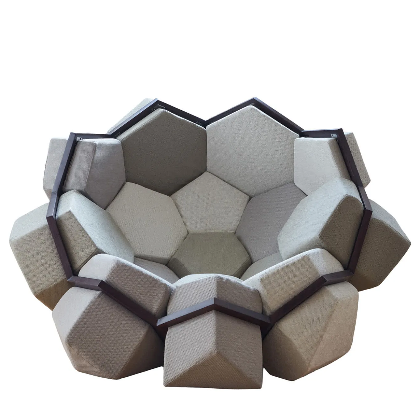Based on a design by Leonardo da Vinci and offering a wrap-around seating experience, this mesmerizing armchair featuring aluminum joints reproduces with its bold look the sharp and voluptuous charm of a quartz shell. Crystal-like elements, that are softly padded, upholstered in textured shades are set into the beehive-shaped frame in sturdy beech finished with a shiny lacquered polish. Crystals are singularly manufactured, making the design truly unique.