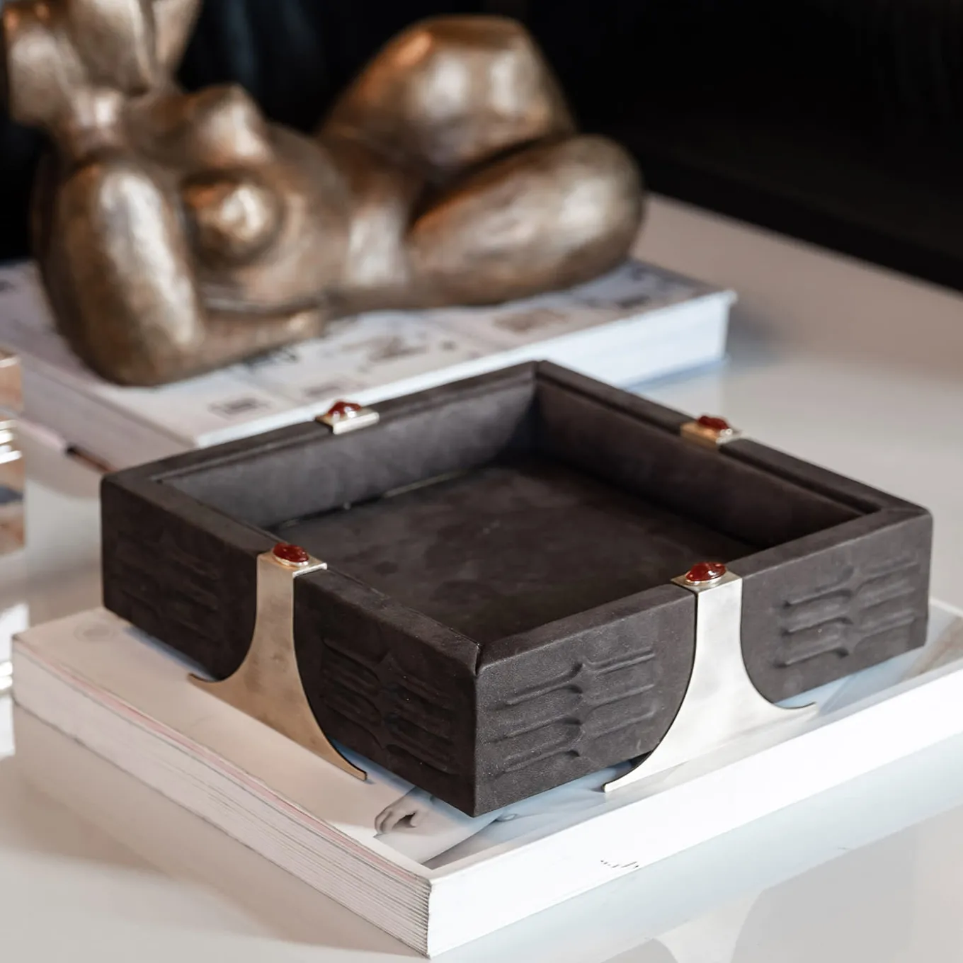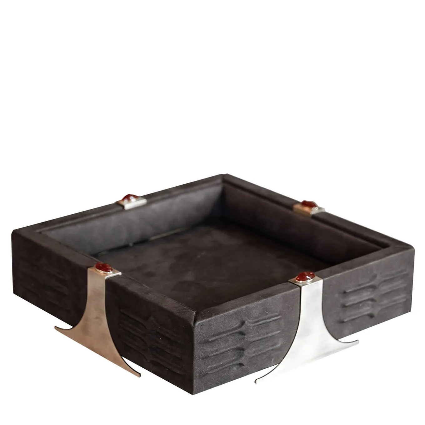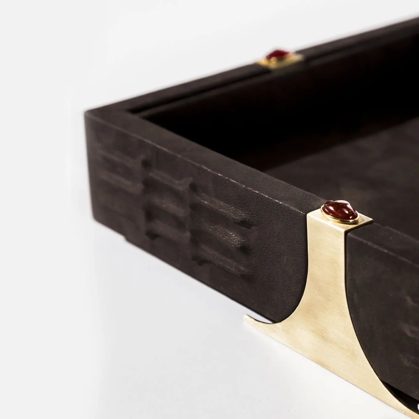 Drawing inspiration from Oscar Niemeyer’s bold brutalist architecture, the RABAN Tray combines imposing lines with poetic sensuality. Crafted in solid wood and wrapped in luxurious brown Nabuck leather, it features textured sides accented by elegant brass inserts. Vibrant Red Corniola stones provide a striking contrast. Also available in other colors, with green agate stones, and in a rectangular version. Contact the Concierge for further details.