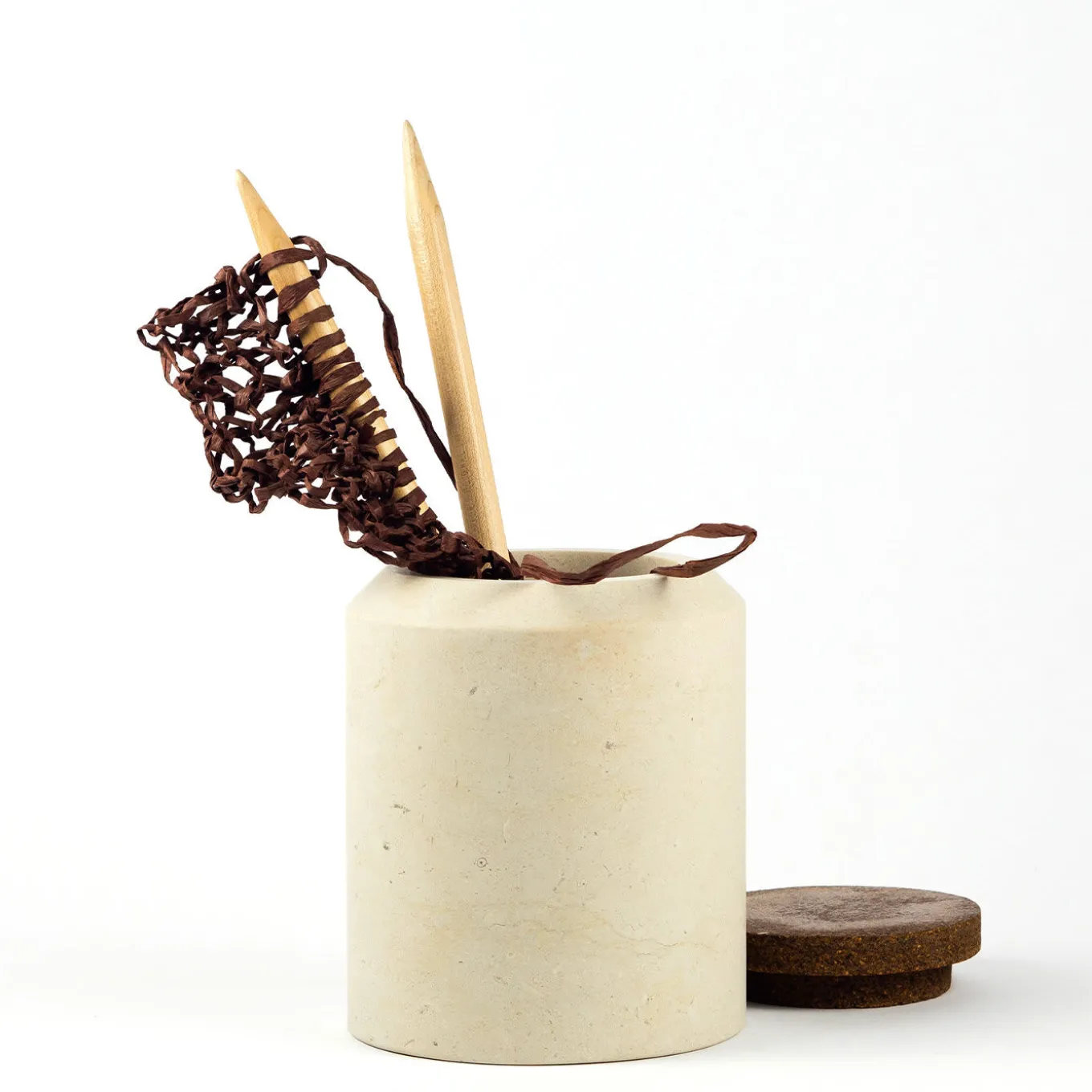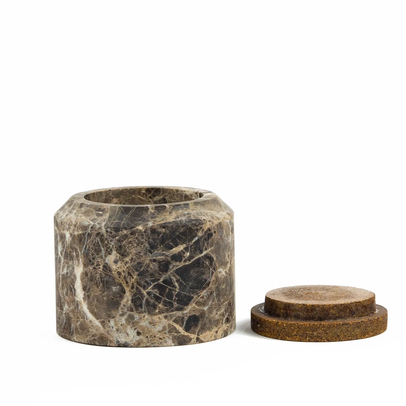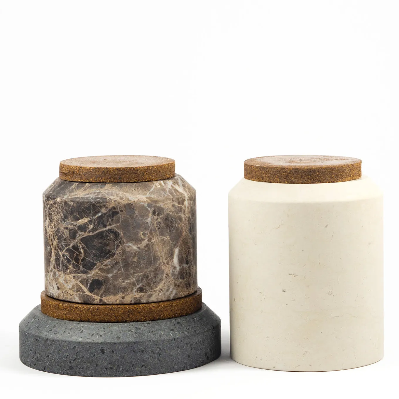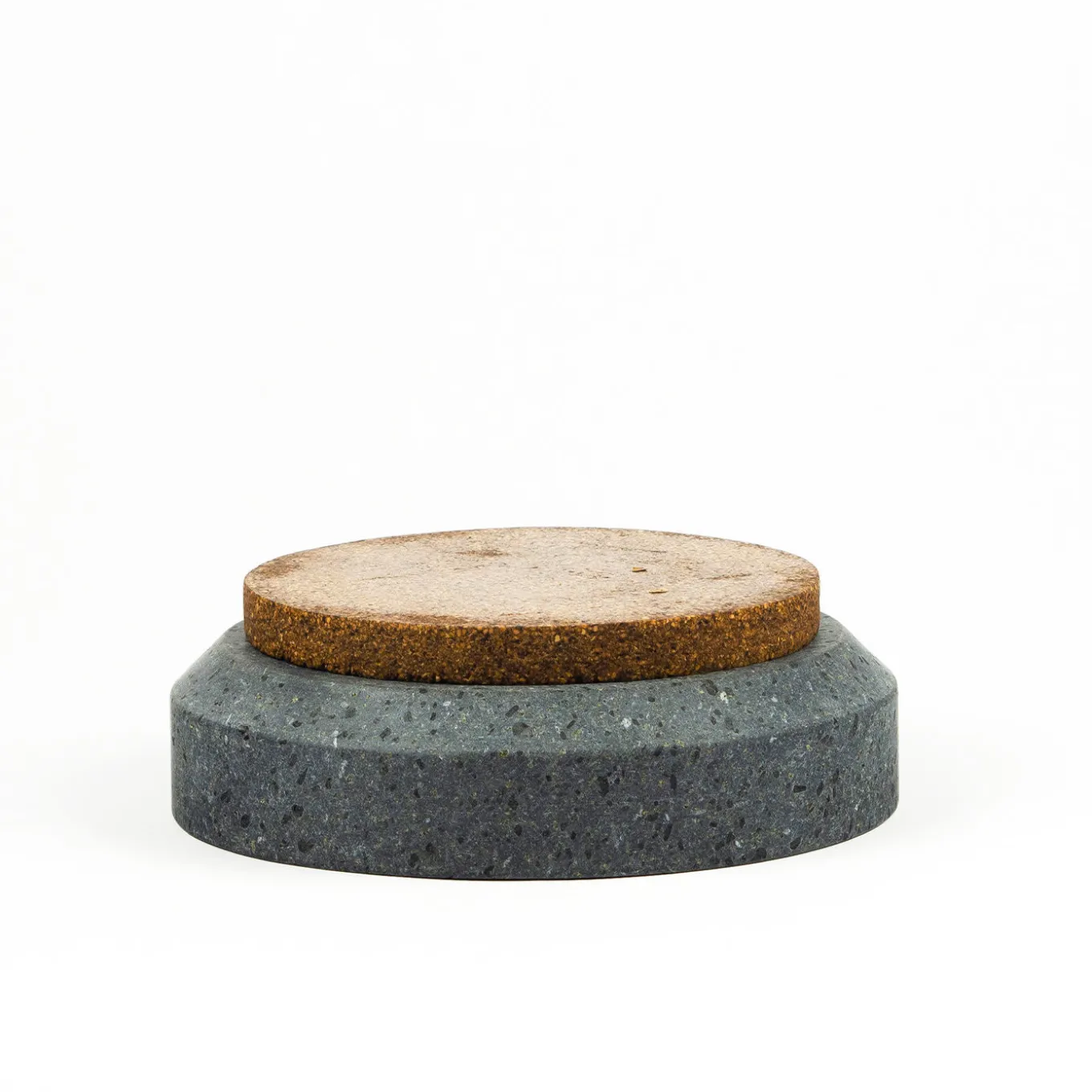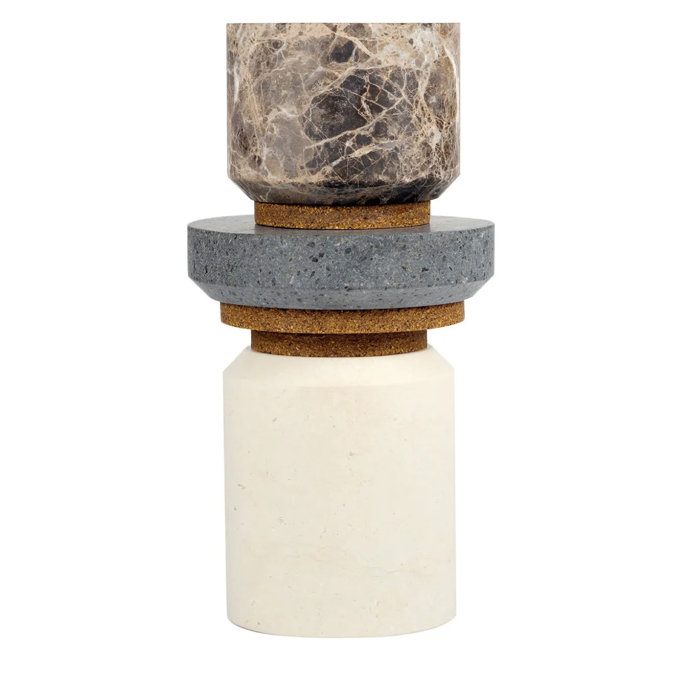 Aesthetic yet practical, this exquisite set is designed by Gumdesign and digitally processed by Alfaterna Marmi. The set features three separate storage pieces made of Trani stone, volcanic stone, and Emperador marble separated by flat, disc-shaped stoppers in Keep Life®. Infinite compositions can be created to be displayed as a single decorative sculptural object or separately as containers for potted plants or any desired objects.