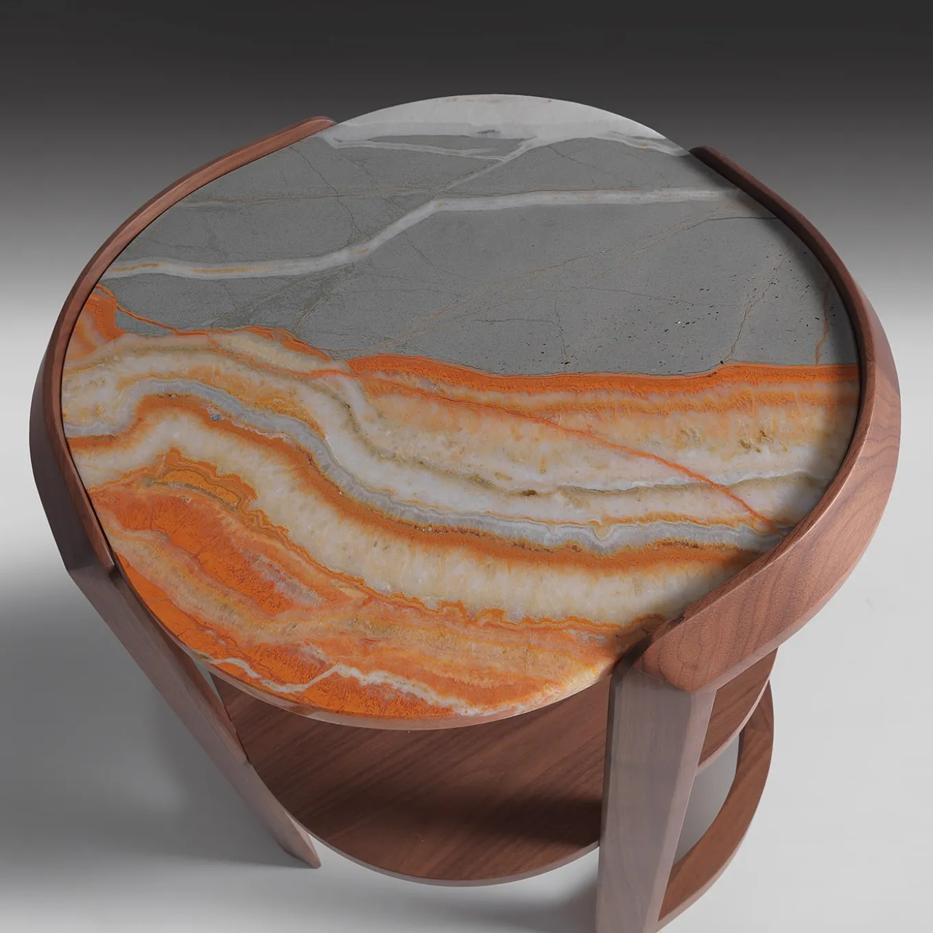 A stupendous design of sophisticated geometric value, this side table will make for an original and captivating complement to a contemporary-style living area. Showcasing sleek rounded lines, it is handcrafted of Canaletto walnut, complete with a round top in first-rate Rainbow marble. Customizable upon request, please contact the Concierge for further details and eventual pricing variations.