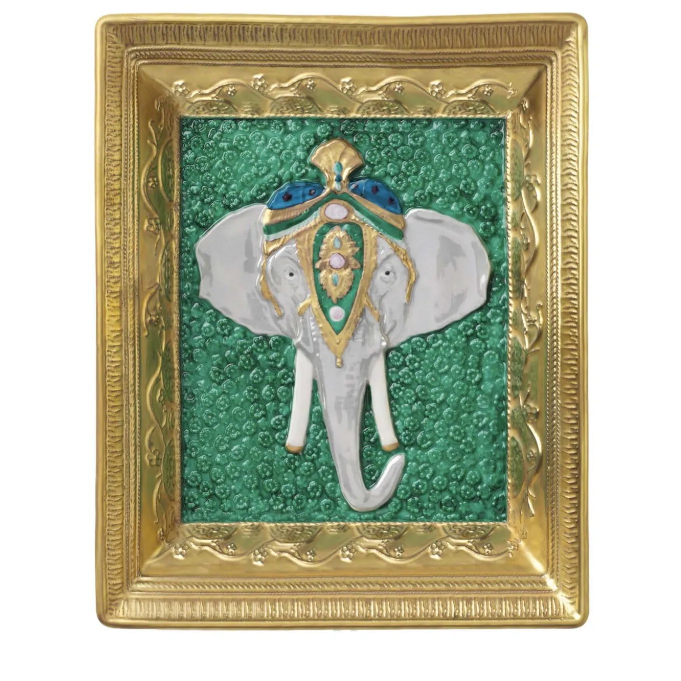 This unique work of art is a sublime homage to the splendid landscape of Rajasthan, a state in northern India. The piece is crafted of fine porcelain and splendidly adorned in vibrant colors, highlighting the exquisite depiction of the head of an elephant. The textured turquoise background is a vibrant contrast to the blue and pearl gray accents and the 24k gold plating, that also graces the rim of the piece.