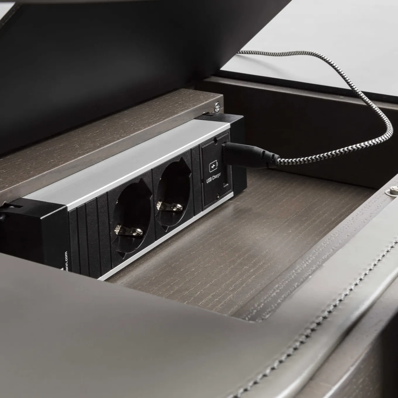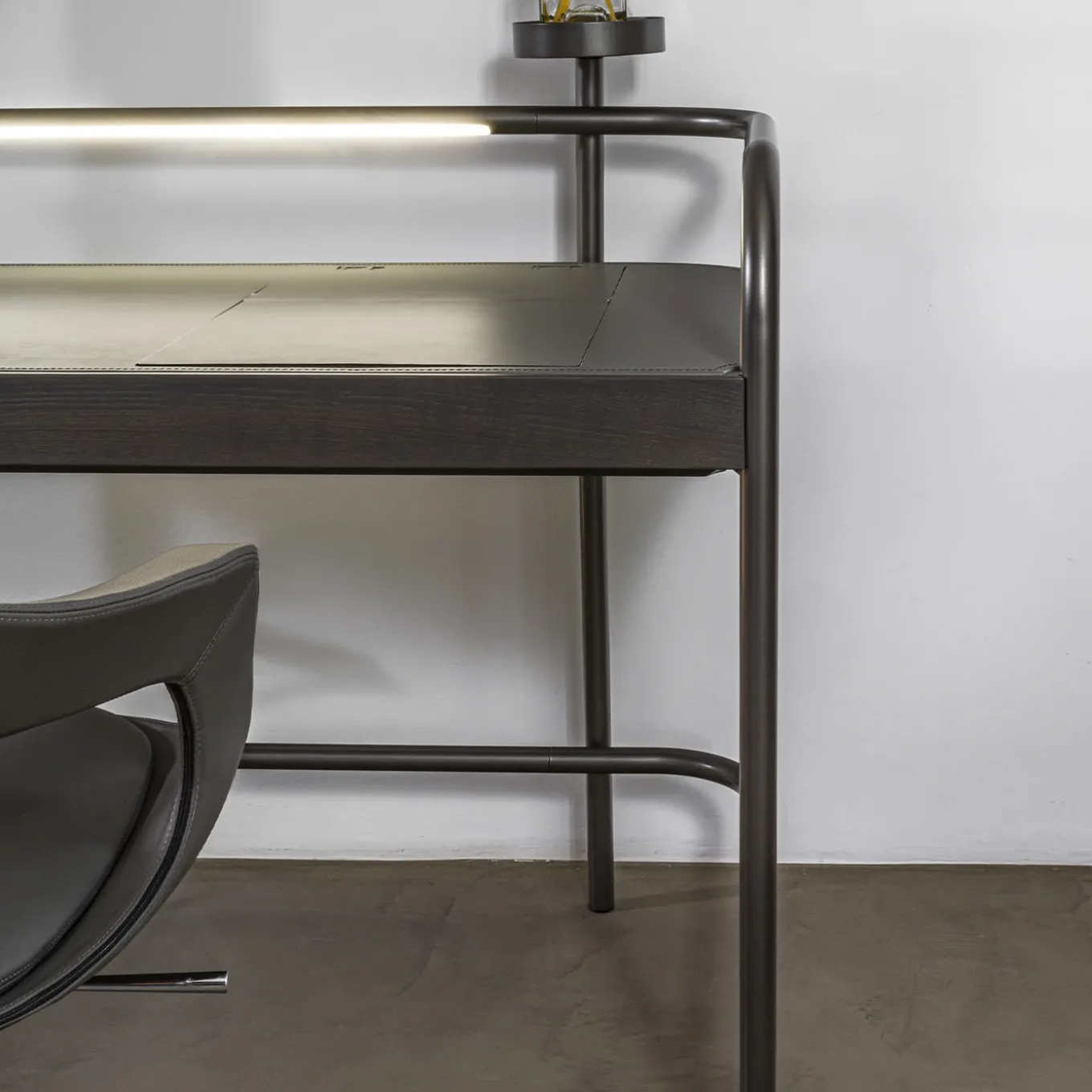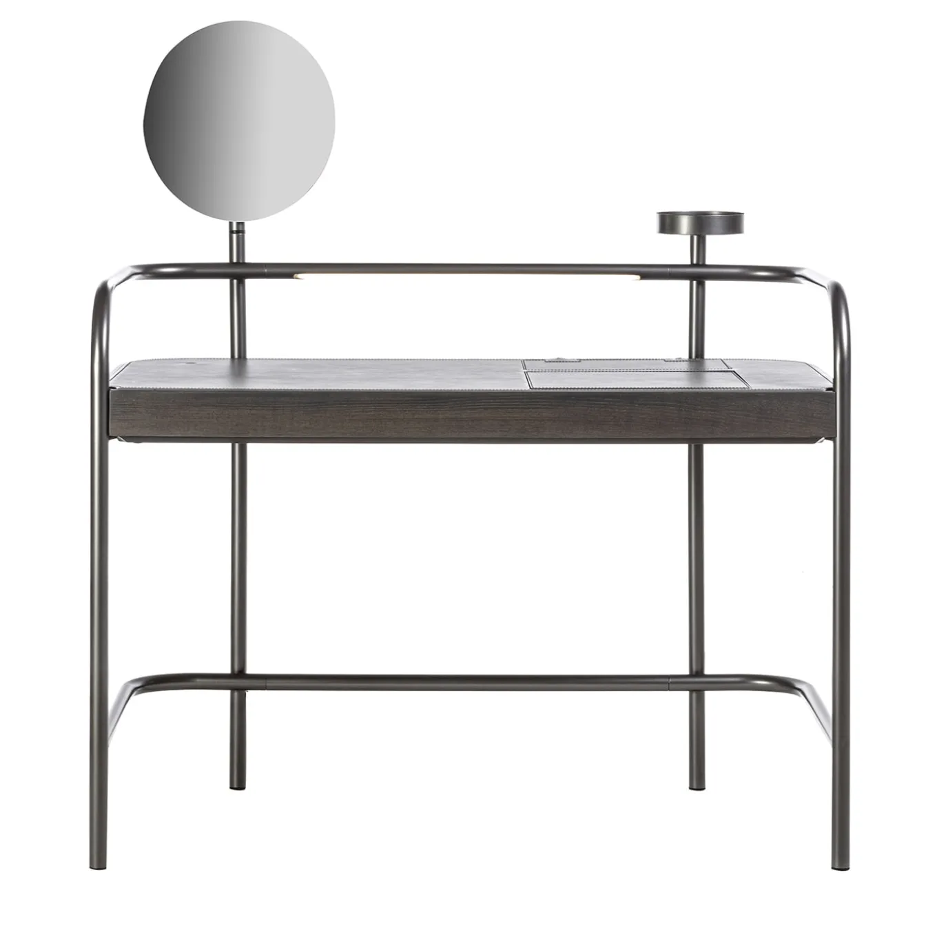 Equipped with a mirror, this writing desk stands out for its exclusive tech-inspired tailored detailing, offering a pleasant experience even when just updating weekly schedules or using one’s laptop. The minimalist, cylindrical metal frame incorporates an LED light with sensor switching technology, for efficient illumination of the wooden top covered in gray leather and equipped with a discreet storage compartment for stationery essentials. Please consult the Concierge for customization options.