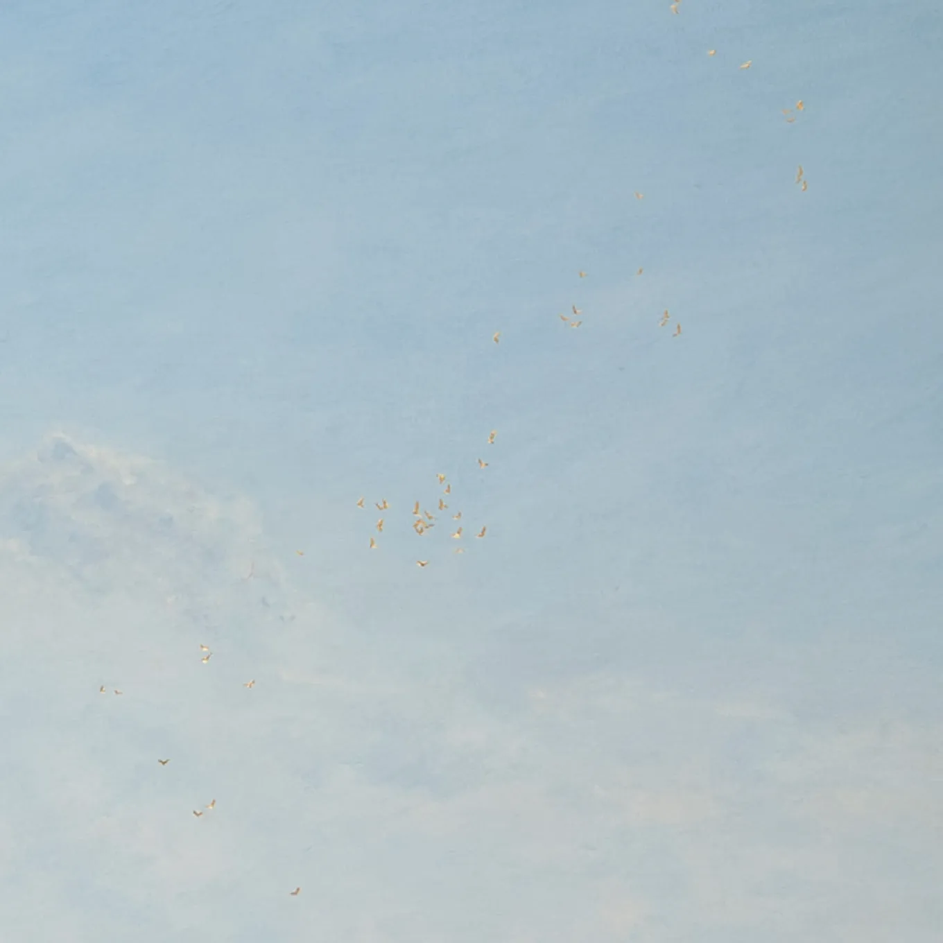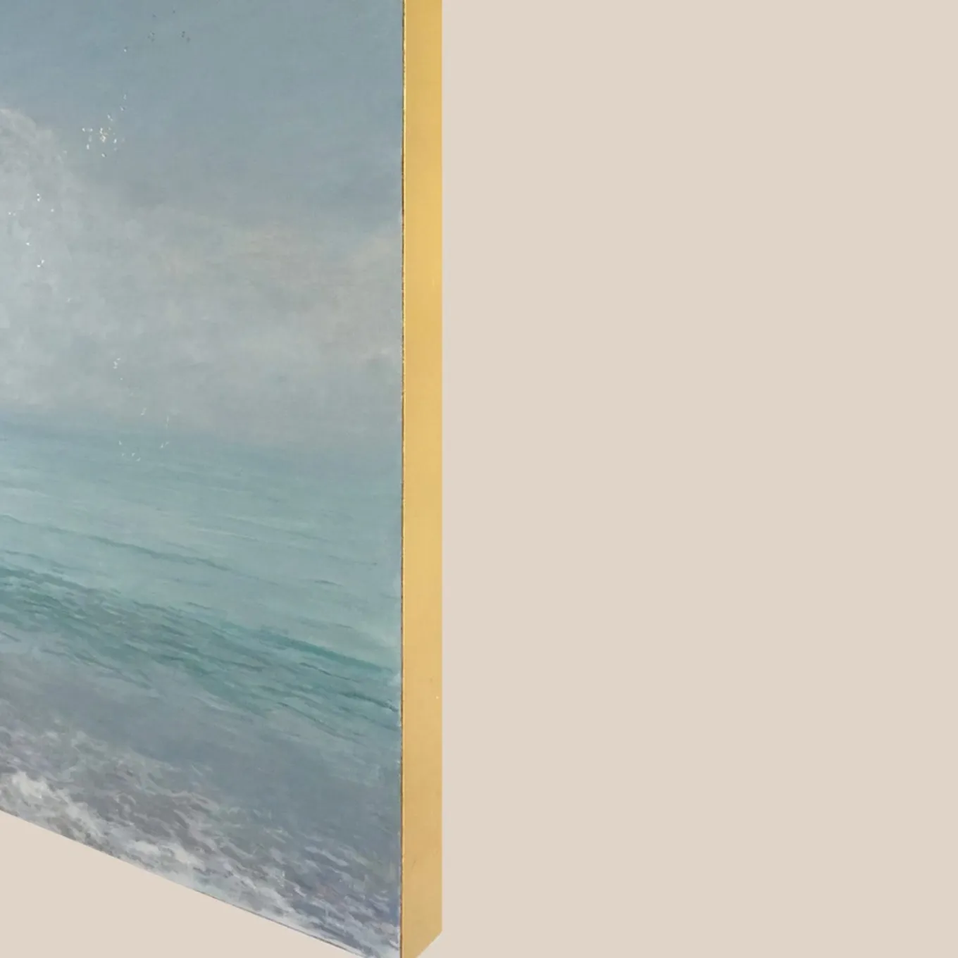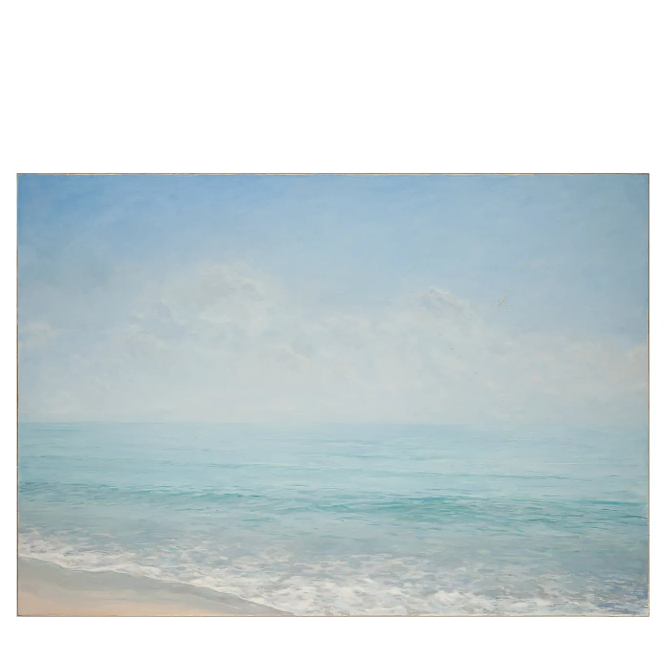 A forgiving sea rolls onto the beach as water swells behind and birds rise, like golden smoke. Decored with 24-carat golden birds and sides. This is an oil painting on wooden panel.