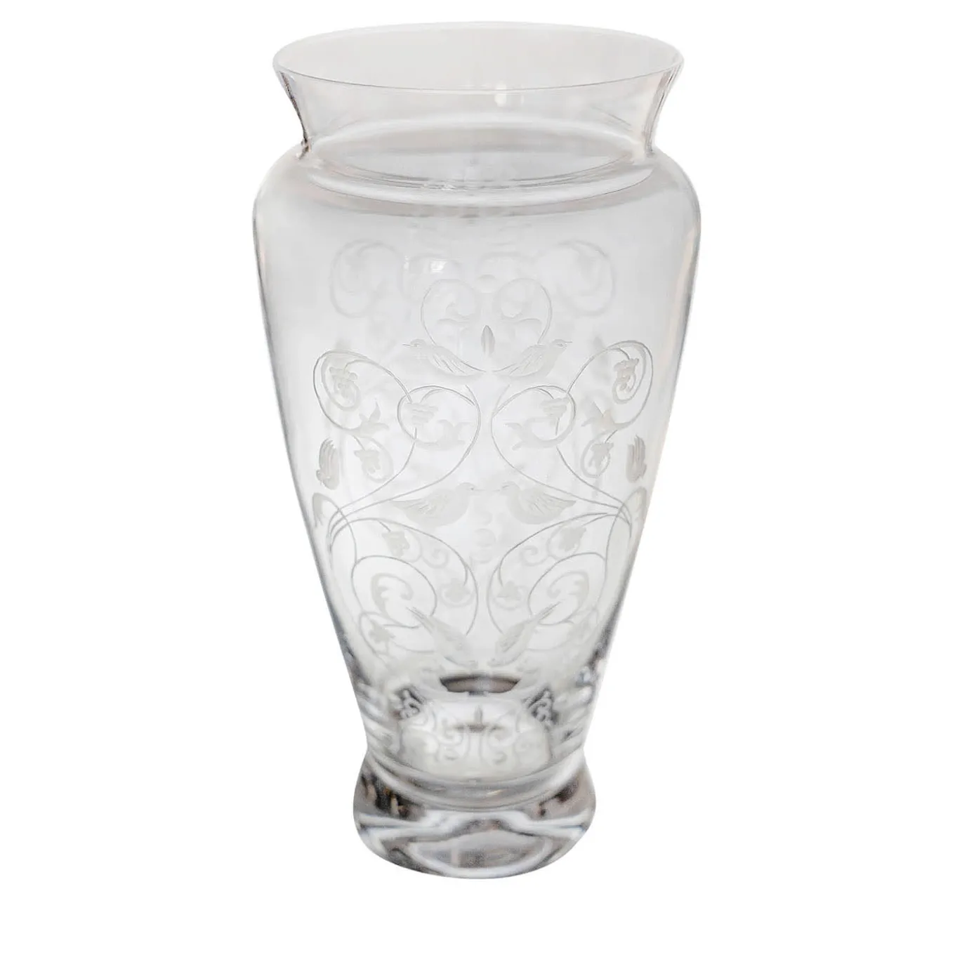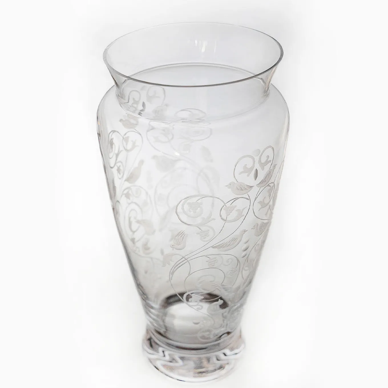 Clear blown glass vase and hand-engraved from a stone wheel with a pattern of ramages with small grapples, birds, leaves and scrolls filling the vase’s surface. Appropriate for usage but also for adorning a space.