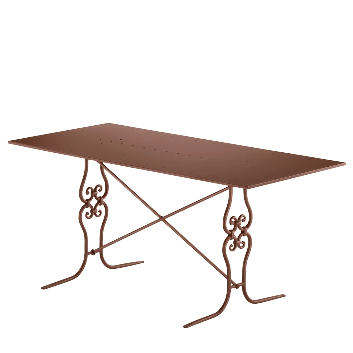 An elegant piece to gather around for a meal on terraces or gardens in good company, this sophisticated table is a clever synthesis of grace and resistance. Powder-coated in Brown for well complementing neutral-toned palette, the galvanized iron frame flaunts lively curls detailing its sinuous legs, elements counterbalanced by the minimalist rigor of the rectangular top. Please explore color variants with the Concierge.