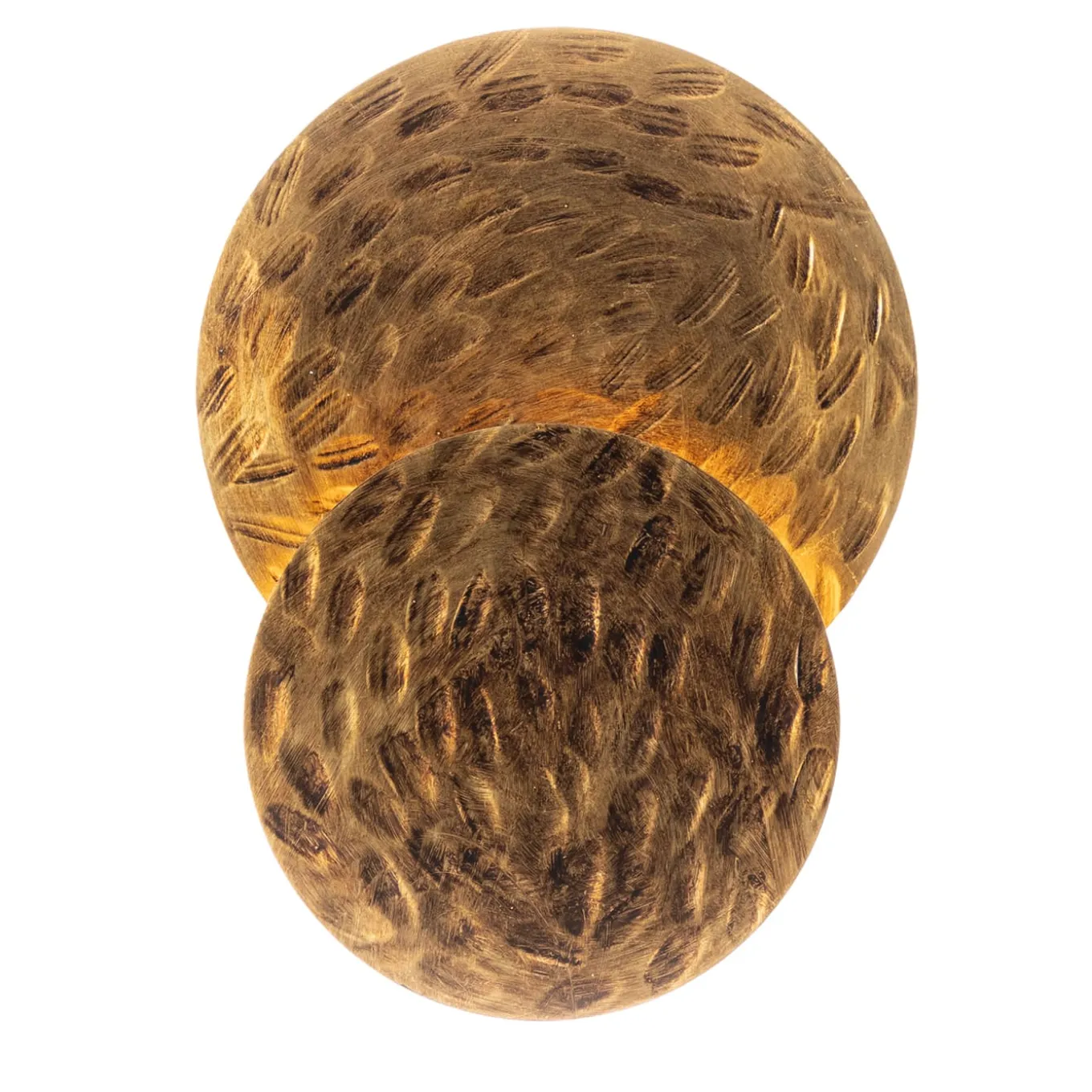 Defined by celestial allure, this mesmerizing wall lamp features two overlapping discs crafted from lustrous golden metal. Each disc boasts a unique rough, shattered pattern that transforms light into an enchanting display. Illumination gracefully spills from the edges and intersections of these discs, casting a sophisticated and mysterious glow. Embrace the captivating allure of celestial bodies with this artistic composition, creating a mesmerizing focal point for any space. Dimmable on request.