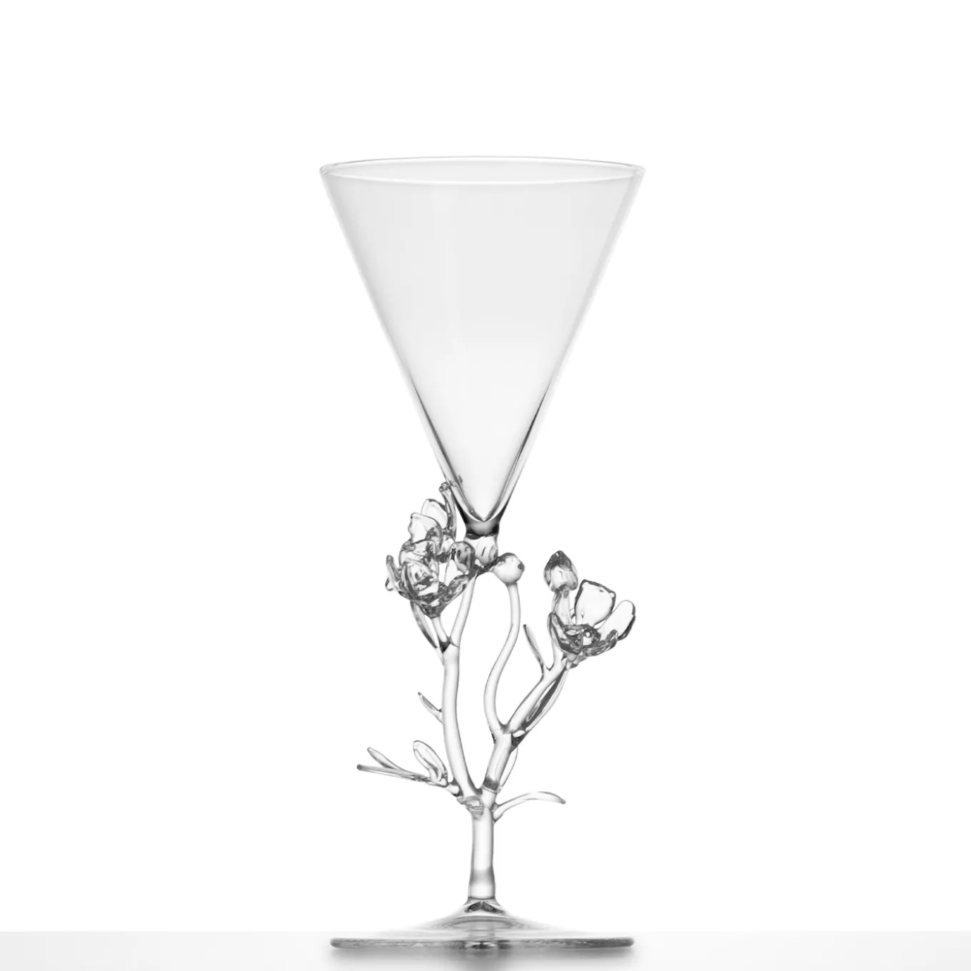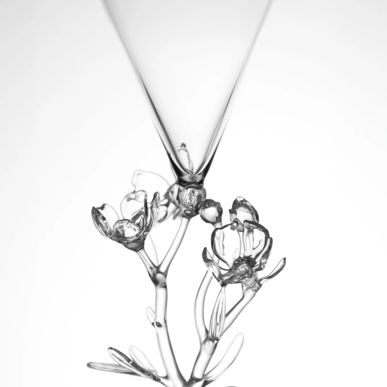 This glass belongs to a collection of 21 unique pieces, each inspired by a different botanical species and reimagined by Simone Crestani from archival Fratelli Toso drawings. Shaped in transparent glass through the flame of the lamp, it evokes a secret garden where petals, stems, and leaves come to life. Each glass is one of a kind — an object that is both functional and artistic, solid and fragile, intimate and universal. Like a flower in bloom, it invites us to contemplate its beauty or raise a toast to the inner garden we all carry within.