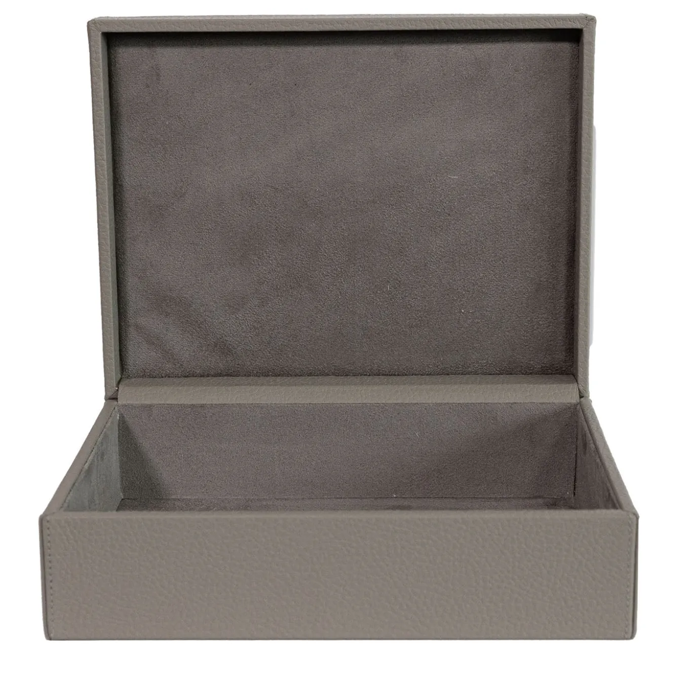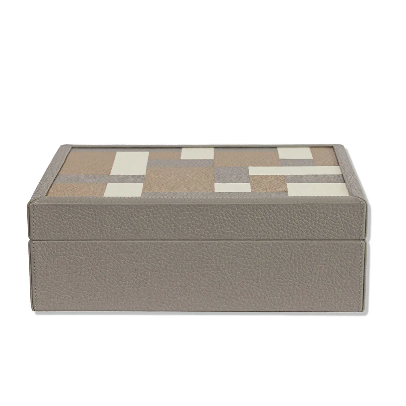 A wooden storage box dressed in fine, soft leather with a delicate handmade inlay on the lid. The interior is lined with microfiber fabric for added protection. This box offers a sophisticated texture in a muted gray tone, ideal for organizing and elevating any home décor setting. The Ravenna box combines functional storage with refined aesthetics.