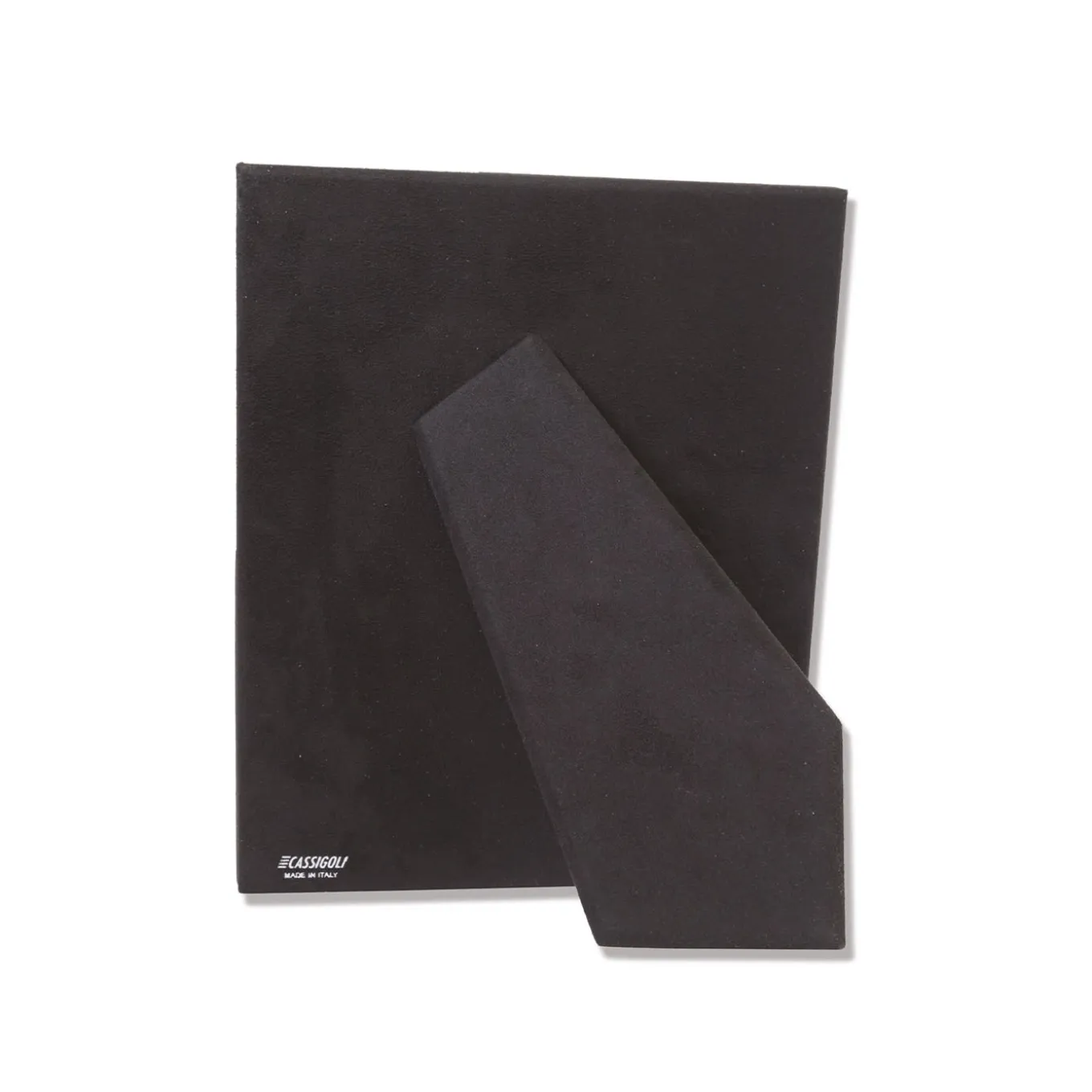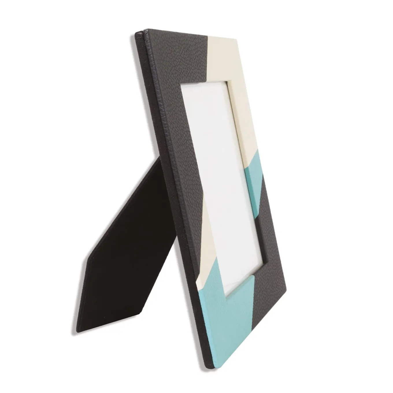 This stupendous wooden photo frame features a modern and versatile character and a precious allure marked by the handcrafted, full-grain leather inlays it showcases. Light blue, black, and white geometric shapes merge into a captivating pattern of bold visual impact. An exquisite gift idea for a loved one.
