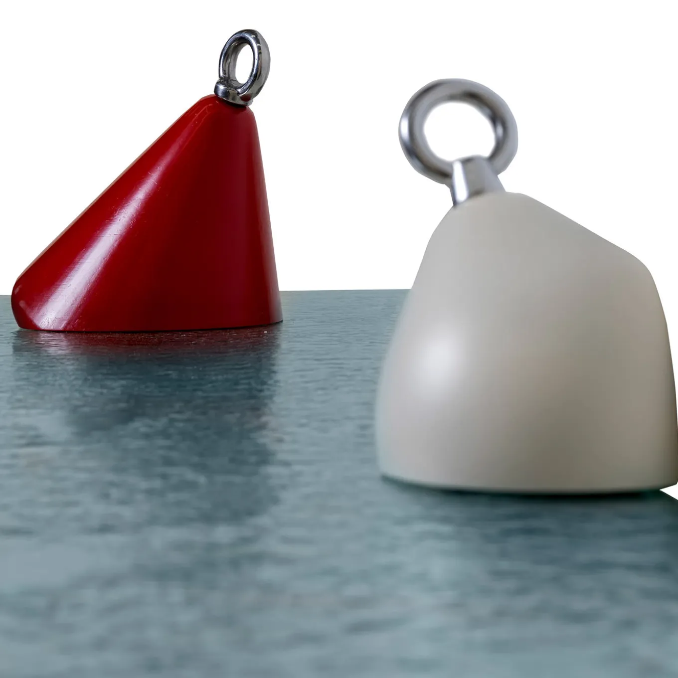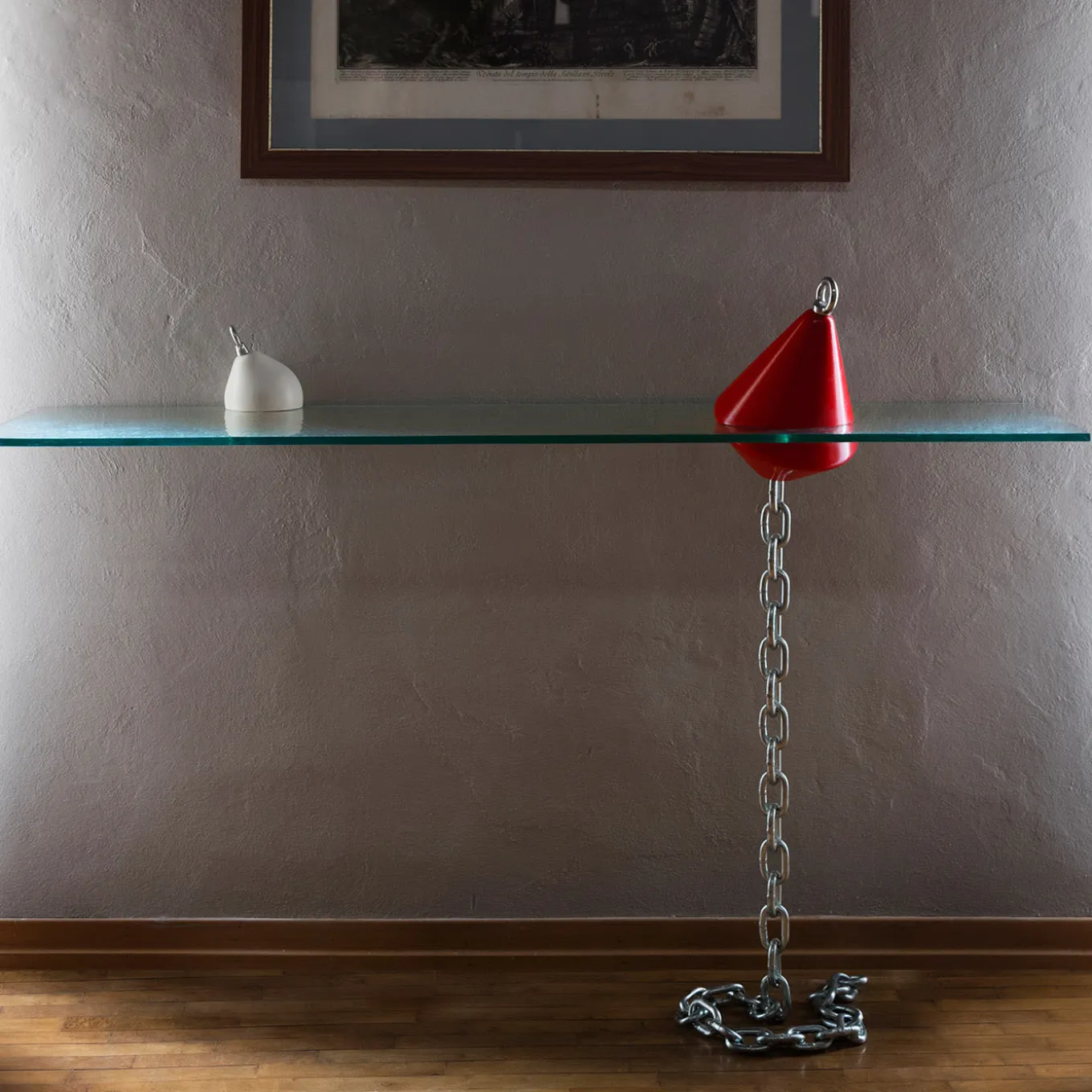 Trying to raise awareness about plastic pollution, surprising in its challenging and defying balance and bright summery colors, the buoy console seemingly floats off the ground as if it were really immersed in the sea. The steel chain which instead of being hanged from it, serves as the main support to the piece, is welded together as a whole column. The bespoke water effect glass top is hung both above the chain and fixed to the wall through a small hook hidden inside the smaller white buoy.