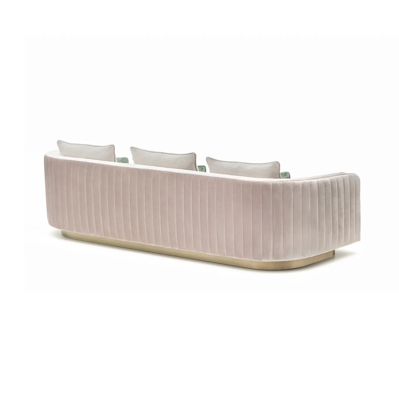 A superb object of functional decor, this sofa will imbue a living room with modern sophistication, while also being a comfortable three-seater. Upholstered in Splendido velvet, with vertical tufting on the enveloping back and armrests, this magnificent piece boasts a pearly white color that complements the glossy horn inserts on both armrests and wooden base with a satin brass finish. Inside, the softness of the seat is ensured by expanded polyurethane foam, goose down, and memory foam padding. Customized dimensions and finishes available – please ask the Concierge for details.