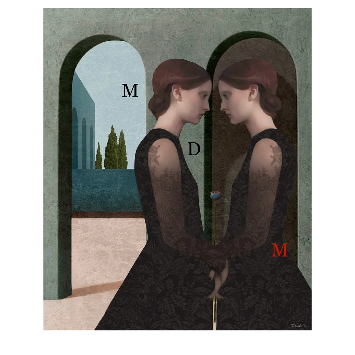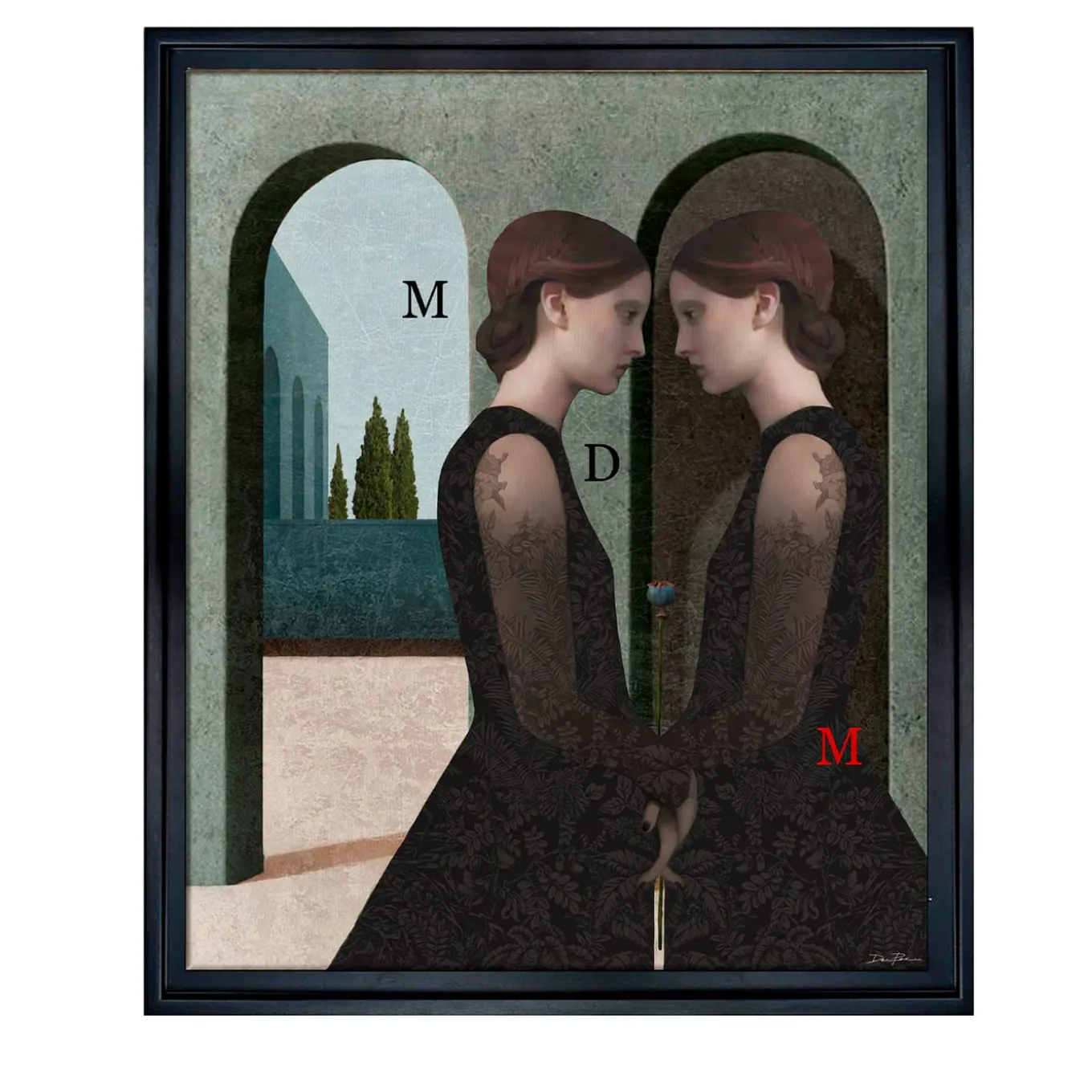 This original artwork by Daria Petrilli is a fine expression of her visionary art, here blending elements from metaphysical art and enigmatic figures. A stimulating rebus surrounds the profiles of two female twins holding hands and looking in the eyes, creating a sense of calm yet tension. Printed on a canvas in prized cotton and mounted on a 4cm-thick dried pine framework, this pop-surrealist print comes in a limewood frame and artist signature. Authenticity certificate included