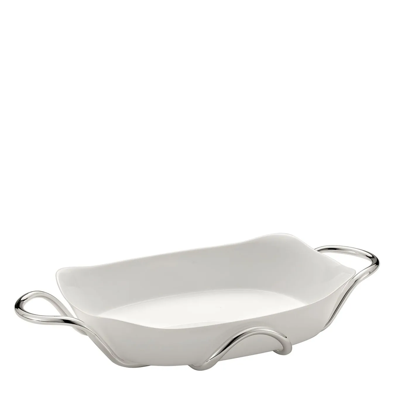 A contemporary spirit clearly conveyed since its fluid lines distinguish this sophisticated ceramic baking dish with brass holders. Enriched with a gleaming silver plating, the cylindrical structure flaunts sinuous curves that well harmonize with the harmonious contours outlining the baking dish. Oval and round counterparts are also available in the Artemest catalog.