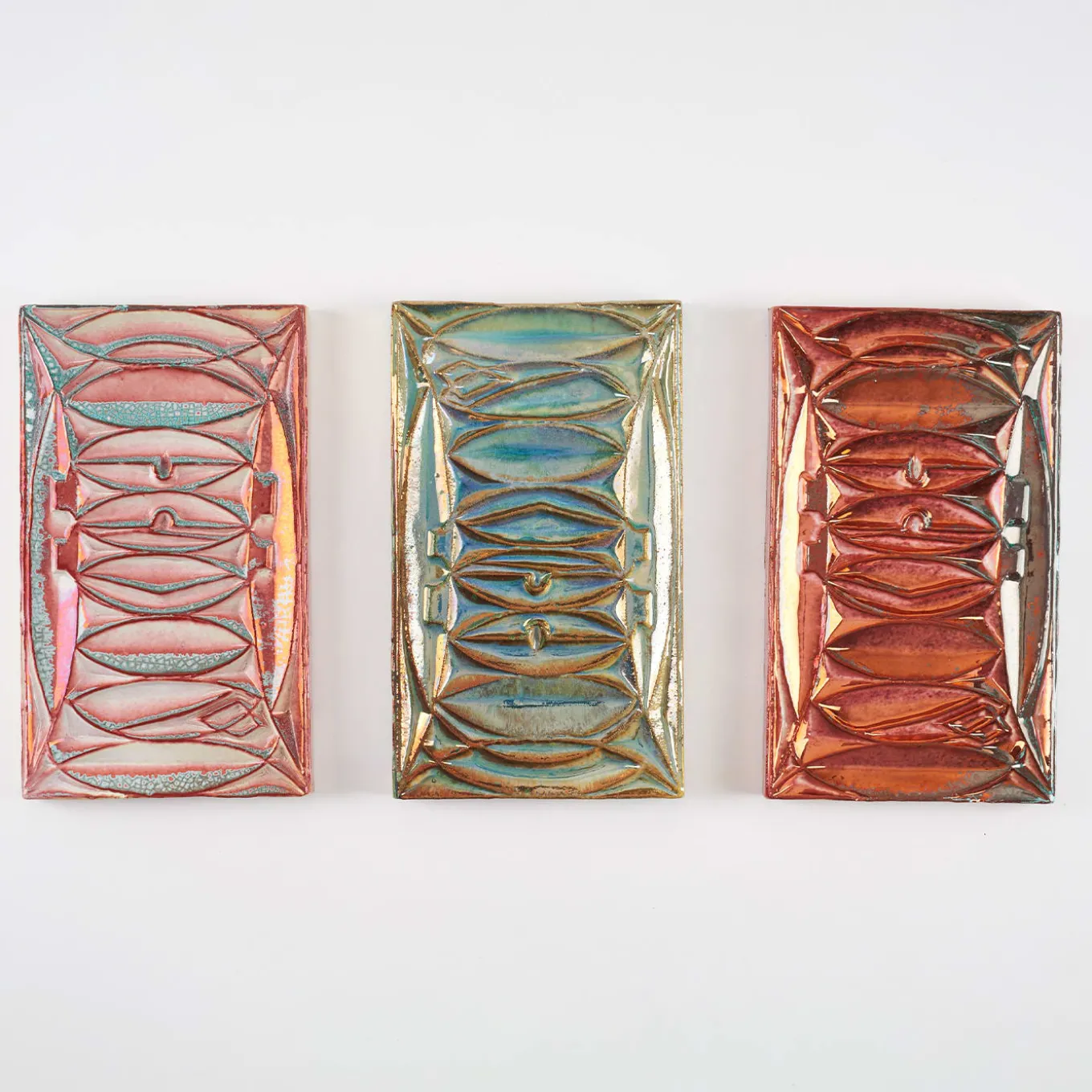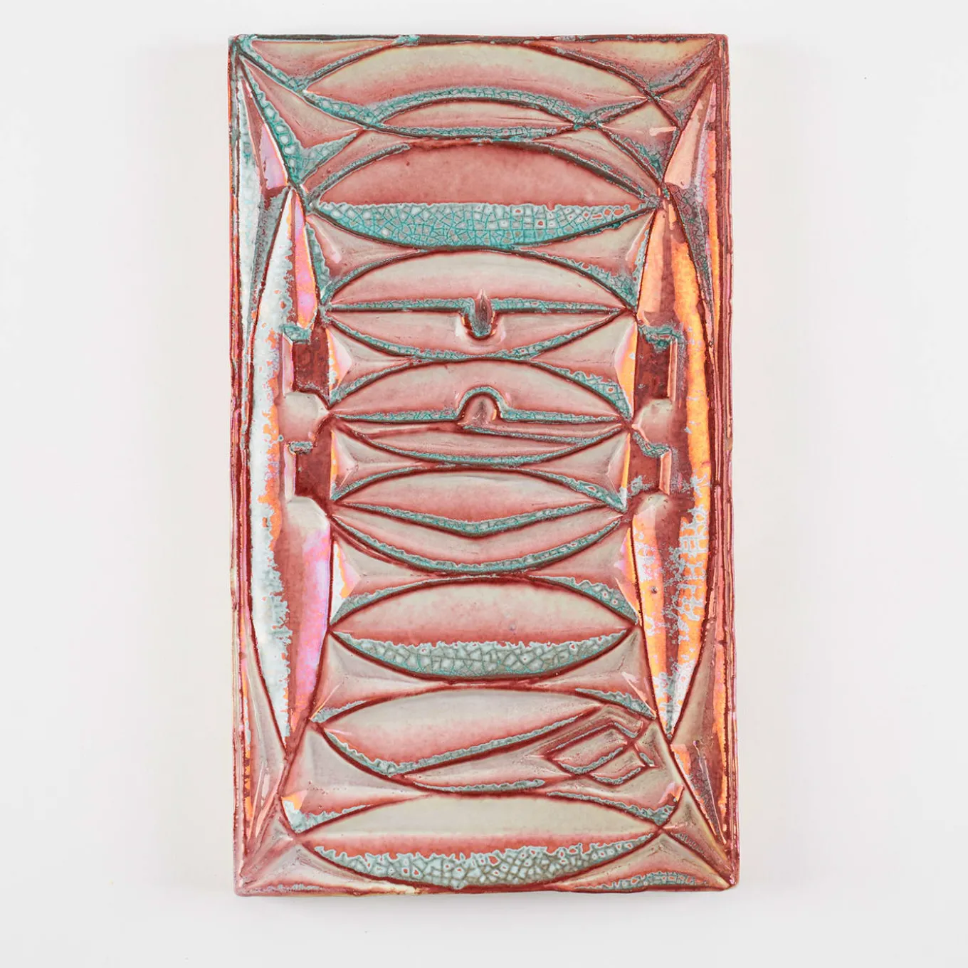 Inspired by molds by Leandro Lega, this rectangular decorative tile in faience belongs to a series designed and selected by architect Marco Scarpa for many of his indoor and outdoor projects. The special second reduction firing brings out from oxides and lusters a special iridescence further enhancing every shade the decoration flaunts. Each tile is a masterpiece that could never have a twin.