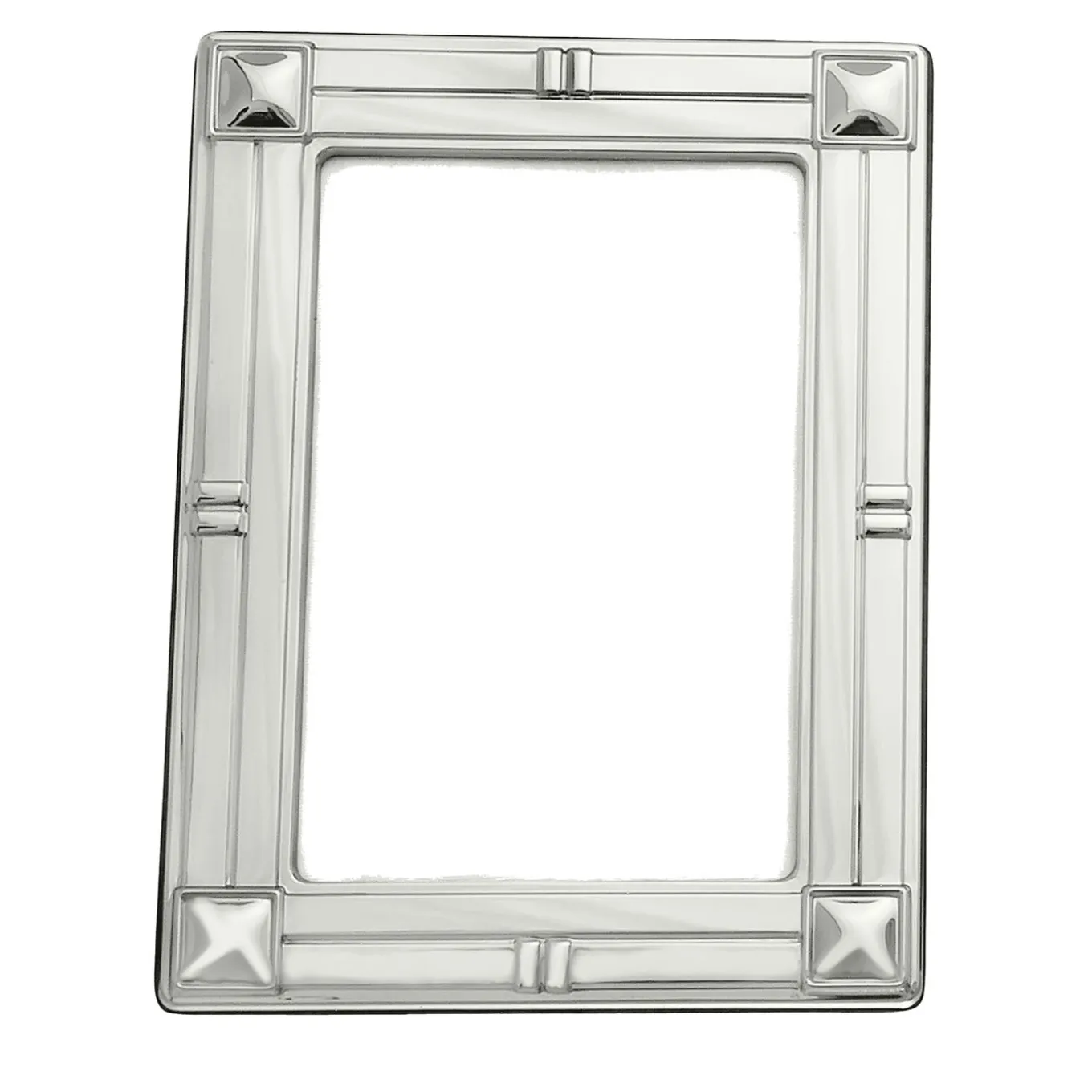 This 925 sterling silver frame updates a traditional style with decorative corner detailing. Elevating any interior space with its timeless elegant, the Rectangular Square Corner Frame is the perfect way to commemorate a special occasion. Featuring a solid mahogany back with a smooth finish and moiré fabric inside, this frame is finished with Schiavon logo closures.