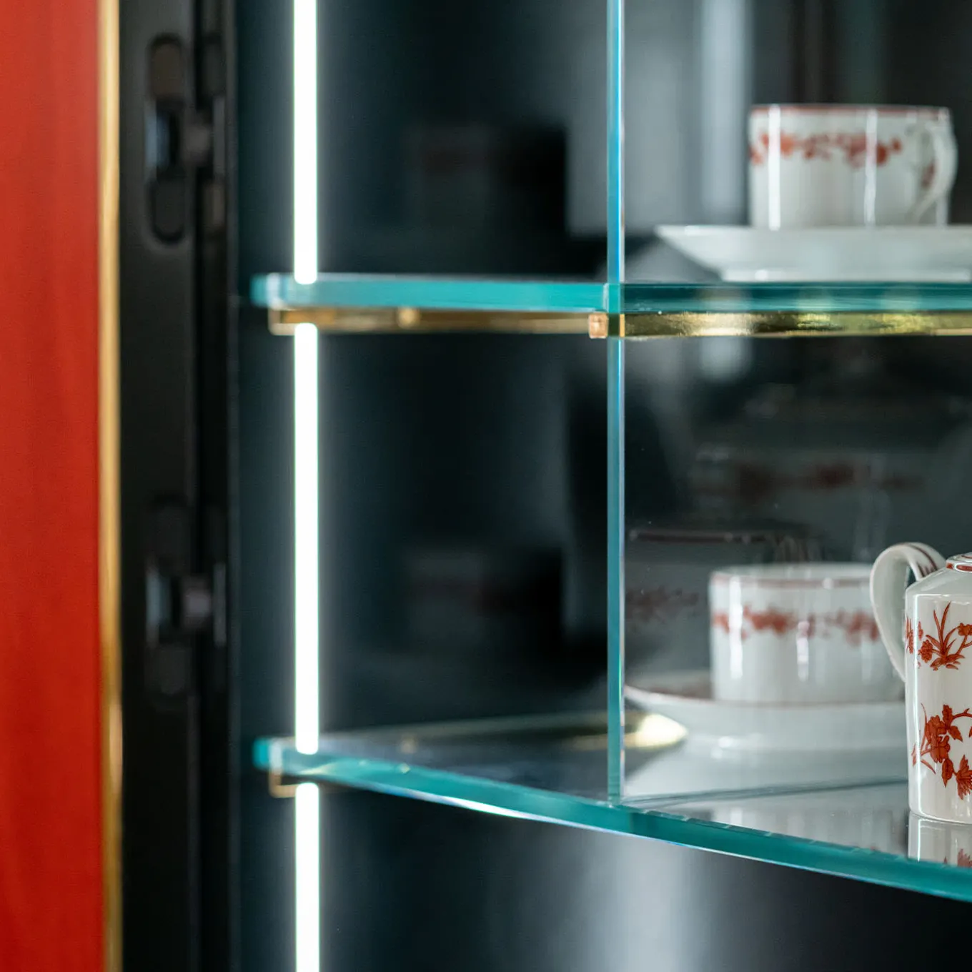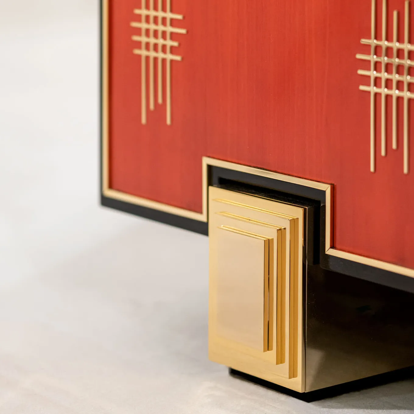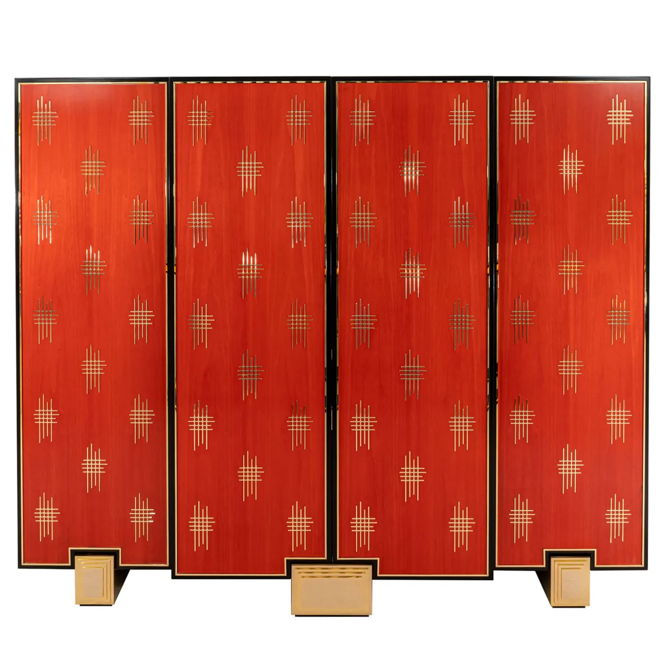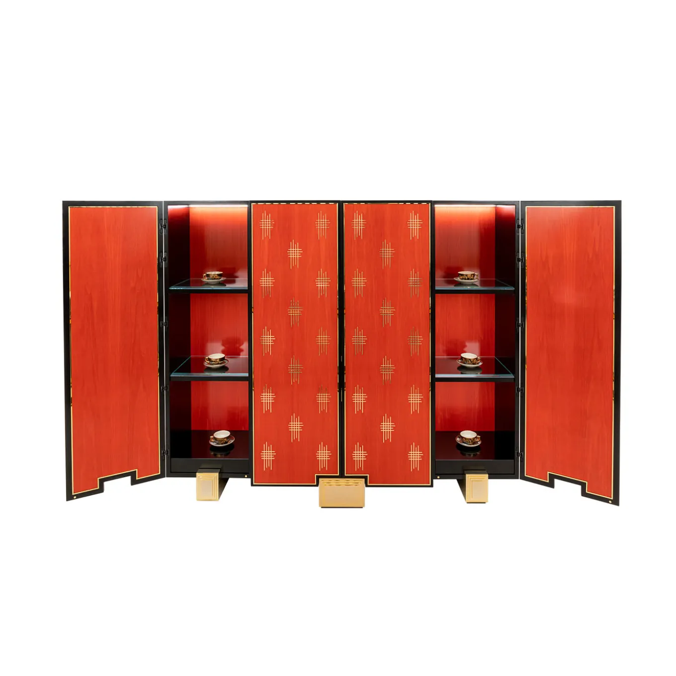 A bold and majestic design marked by red and golden shades, this spectacular bar cabinet will make for a precious addition to a living room or dining room decor. Plated with red Bolivar wood enriched with black wooden borders and 18K gold-plated brass details, its interior features pull-out drawers, shelves, and a mirror on the back. Please contact the Concierge for further details.
