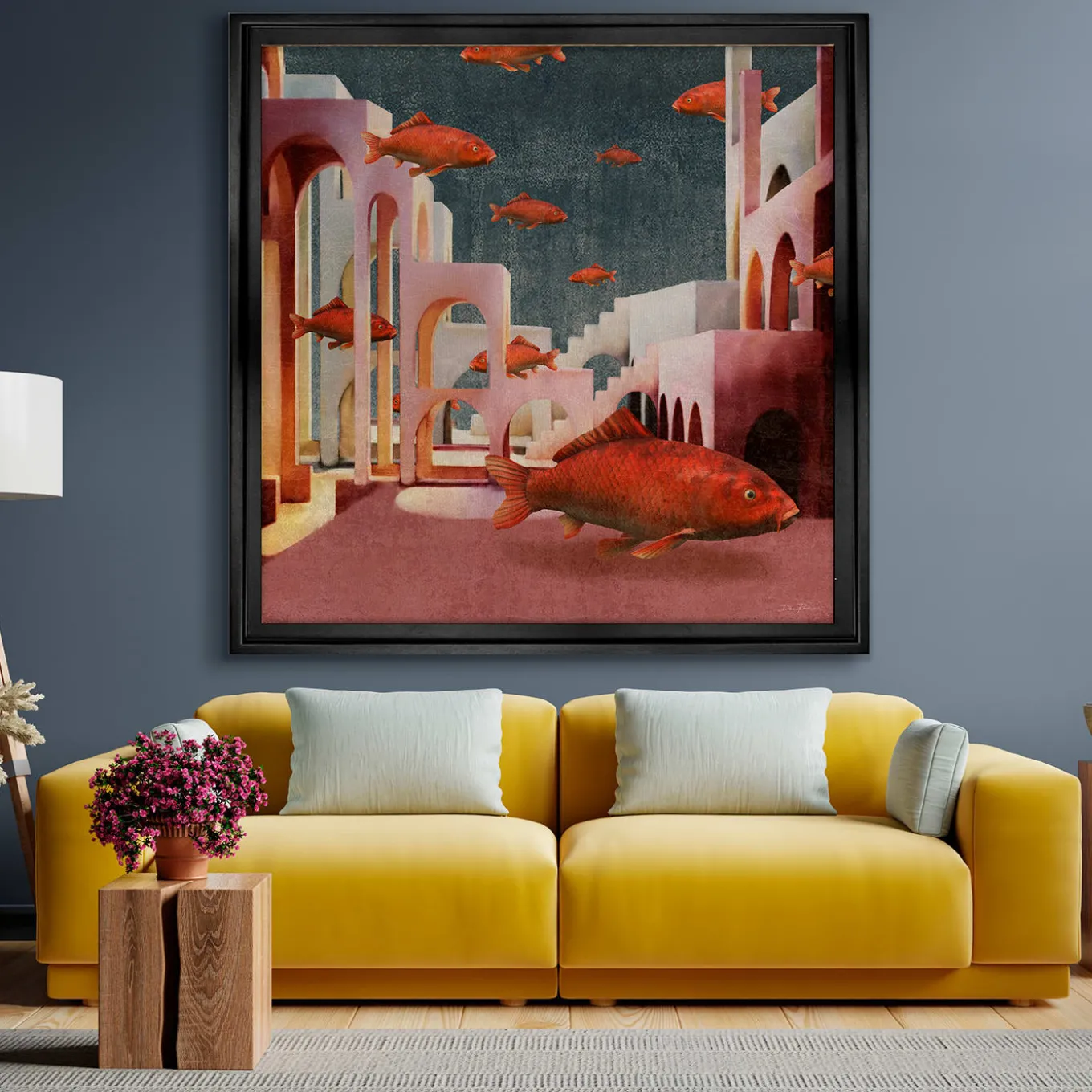 An homage to metaphysical art rendered with the warm tones typical of Renaissance, this Daria Petrilli original print on fine cotton canvas brings to life an unlikely fish tank made of arches and staircases where giant red fish swim. A fine expression of pop-surrealism, it belongs to a series of limited-edition designs coming signed and supplied with authenticity certificate. A Limewood frame and a dried pine framework complete the piece.