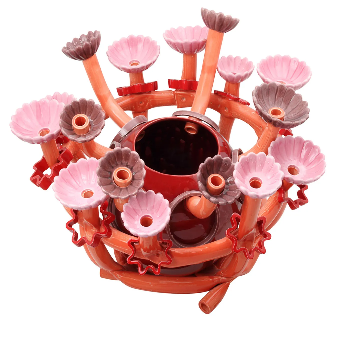 Polychrome ceramic is shaped into an ornamental floral vase in pink, orange and burgundy. Handcrafted flawlessly by contemporary master ceramic artist Roberto Cambi, this design piece is a colorful interpretation of one of his signature creations.