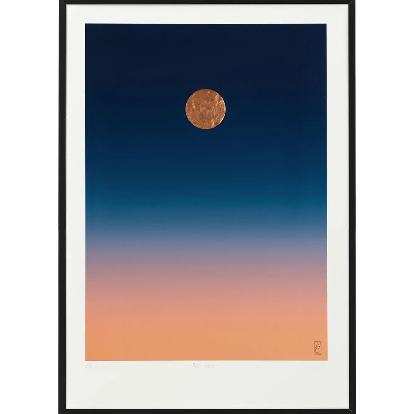 This romantic glycée-type print on 100% cotton was inspired by the famous line “Che fai tu, luna, in ciel? dimmi, che fai, silenziosa luna?” poet Giacomo Leopardi dedicated to the moon. The full moon – fashioned of a silver plate – stands against a dreamlike backdrop where deep blue progressively fades into apricot orange, evoking a sunset. Please ask the Concierge about the pricing of the frame (not included) and the variant measuring 50x70cm.
