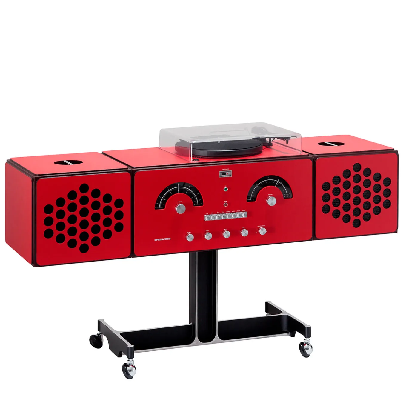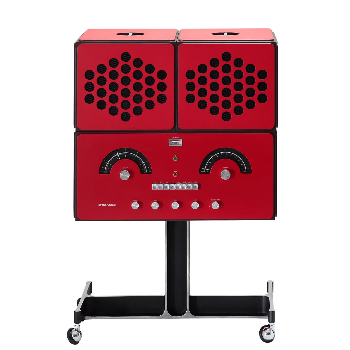 Dynamic and innovative with an accent of vintage sophistication, this radiogram is a 1965 design by Achille and Pier Giacomo Castiglioni. Masterfully crafted by expert hands, this singular piece is fashioned of red-lacquered wood and aluminum. Resting on swivel wheels for easy use and portability, it features adjustable speakers, an AM/FM radio system, a turntable and AUX inputs. It is possible to connect other sources, as well as other systems to receive audio signals via Wi-Fi and Bluetooth (through external devices, not included in the price).