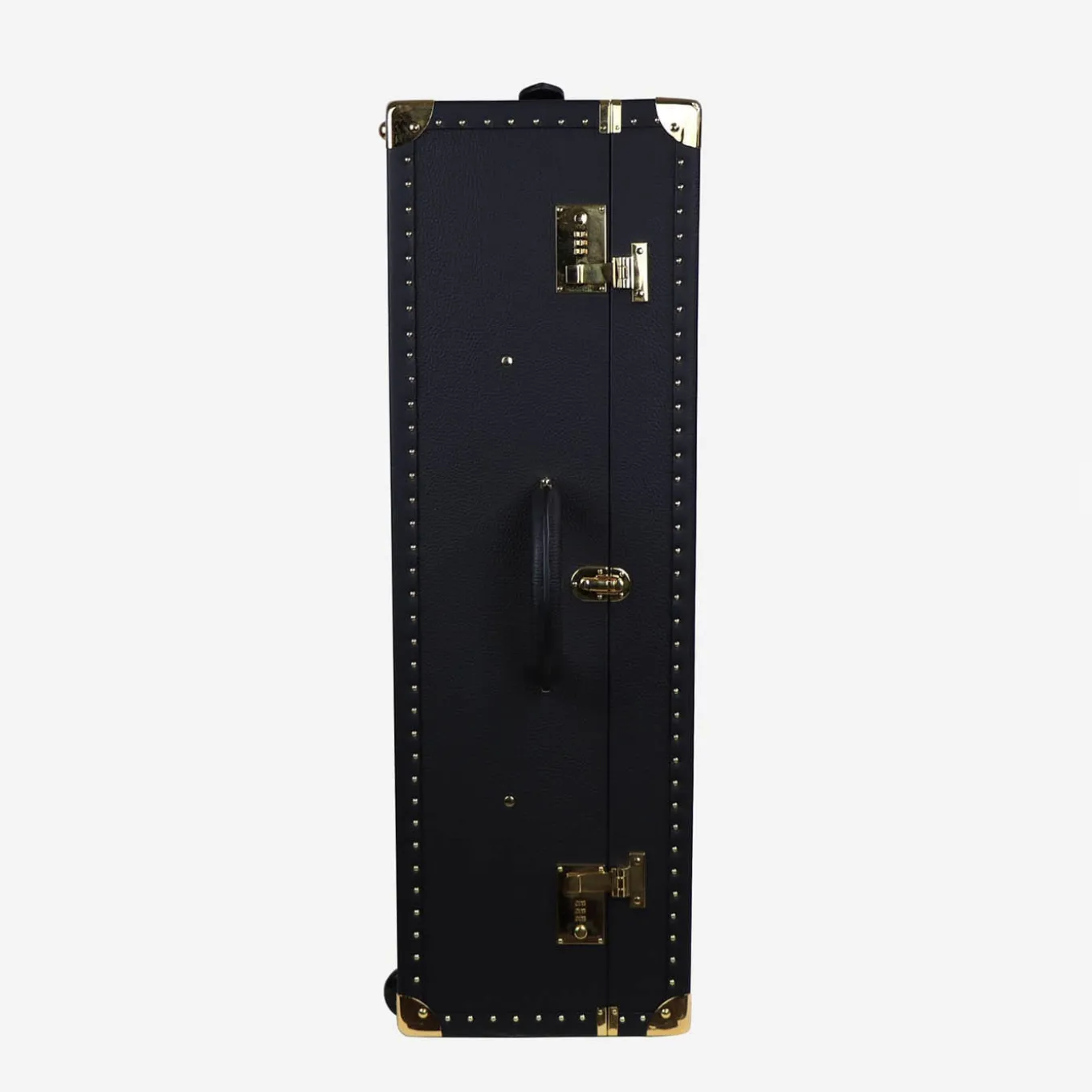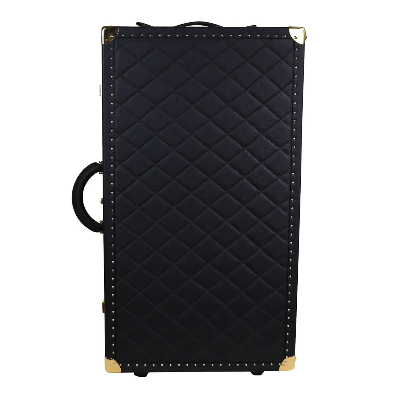 Classic opulence and cutting-edge performance meet in this precious artisan suitcase of traditional inspiration. Featuring tiny wheels and inner belts for optimized practicality, it is also equipped with two handles and a combination lock attesting to its classic personality. Corner caps and studs finished in gold further embellish its prized quilted cover in genuine black leather. Wide enough to host jewel essentials.