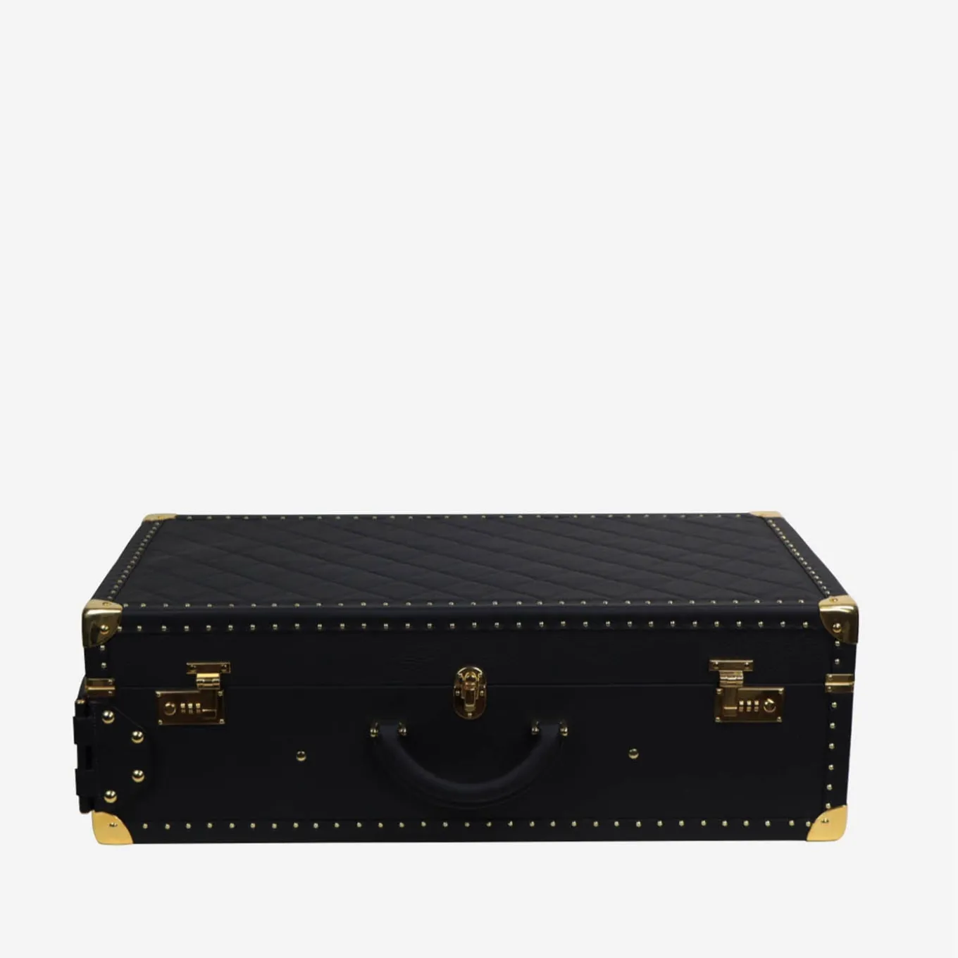 A classic design reinterpreted in a timeless sartorial key, this small artisan suitcase – also available in other two size options – is the perfect gift for frequent travels not renouncing class. A quilted cover in genuine black leather envelops its silhouette, adorned with golden hardware and cleverly equipped with handles and a practical wheel. Belts keep clothes in place on the refined lined inner compartment.