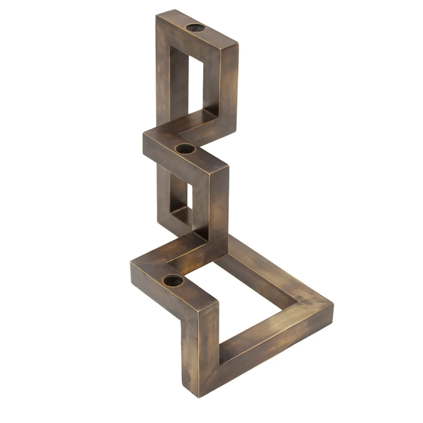 This multi-leveled three-arm candelabra is a design by Francesco della Femina, executed using bronzed brass by skilled metal workers in the old workshop of Rua Catalana in Naples. Each arm stands at a different height, giving movement to the structure, which is especially suitable as centerpiece.