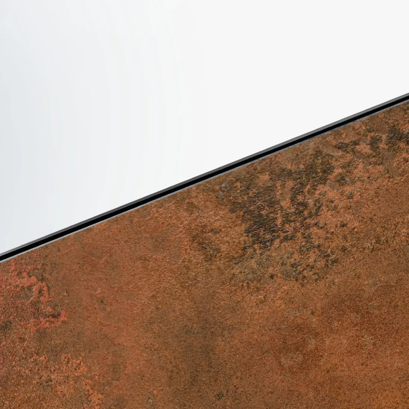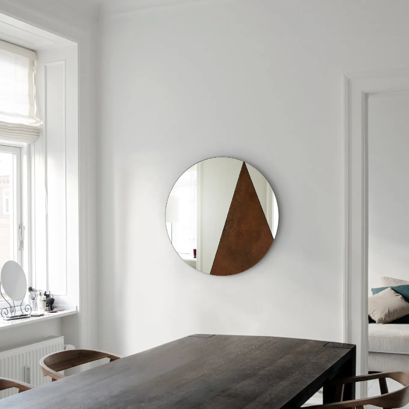 This exquisite mirror is manufactured by hand and will make a statement in a minimalist setting, adding a functional reflective surface and stunning decorative accent to a contemporary entryway or industrial living room. The round silhouette features a wooden base with three elements, two in mirrored glass and one in corten steel, joint in a steel frame. The effect is bold and dynamic and can be combined with other pieces from Atlas for a cohesive effect.