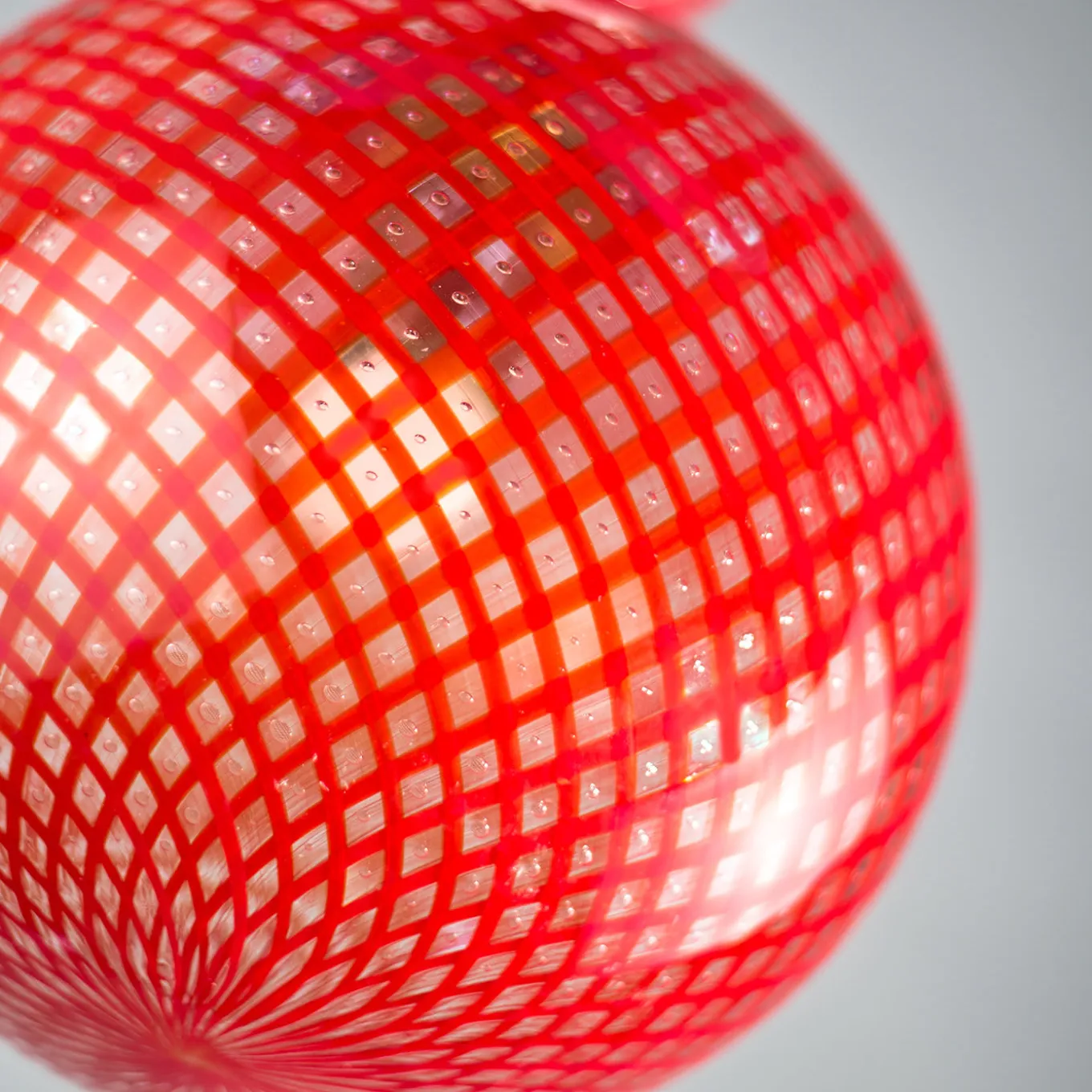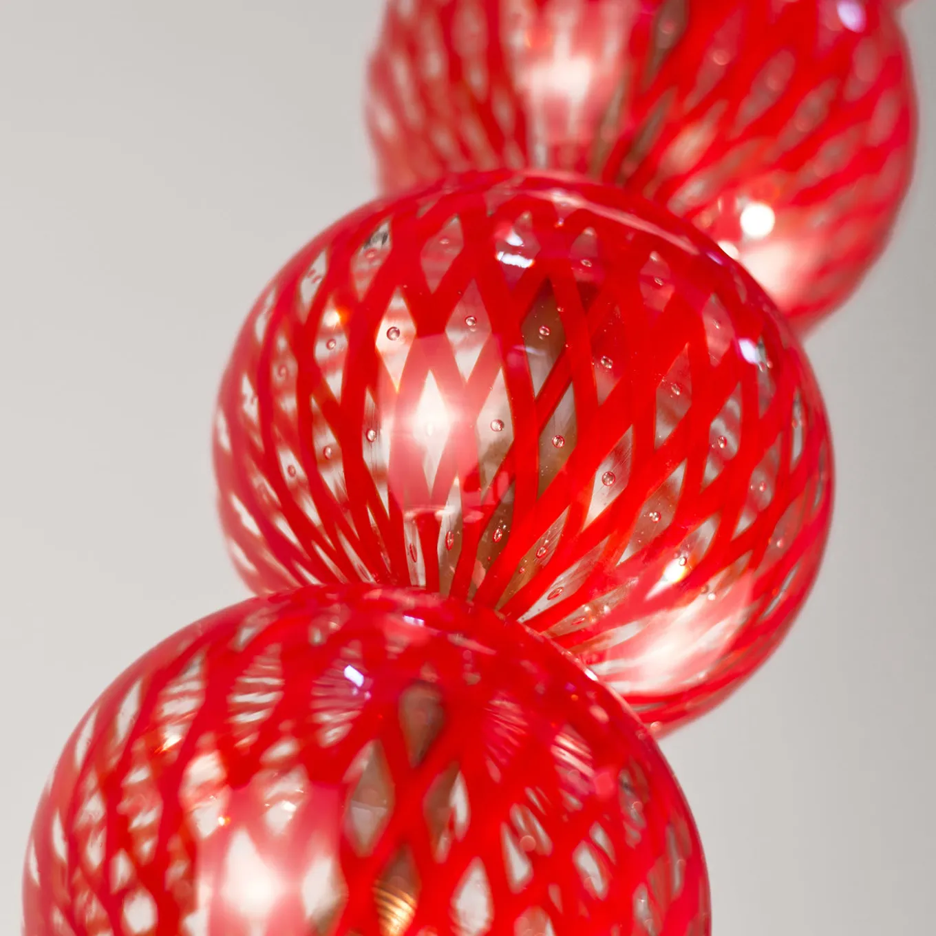 Inspired by the 1920’s Venetian trend of glass vegetables and fruit, this chandelier is inspired by gooseberries. With a minimalist design for contemporary homes, the glass spheres are made in red and transparent glass using the reticello technique to create tiny rhombuses that capture small bubbles of air. The stem is topped with a white glass flower.