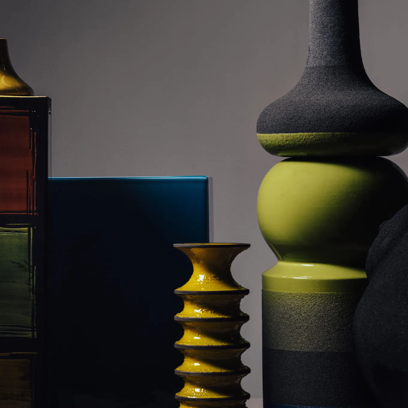 Marked by a prominent, ribbed profile and a silhouette painted in a vivid hue of yellow with brown details, this appealing decorative vase belongs to the Revolver Collection, presented at the Milan Design Week in 2019. The progressive thinning out of the distance between the ribs proceeds vertically from the top to the base constituting the outstanding, intriguing detail of this design.