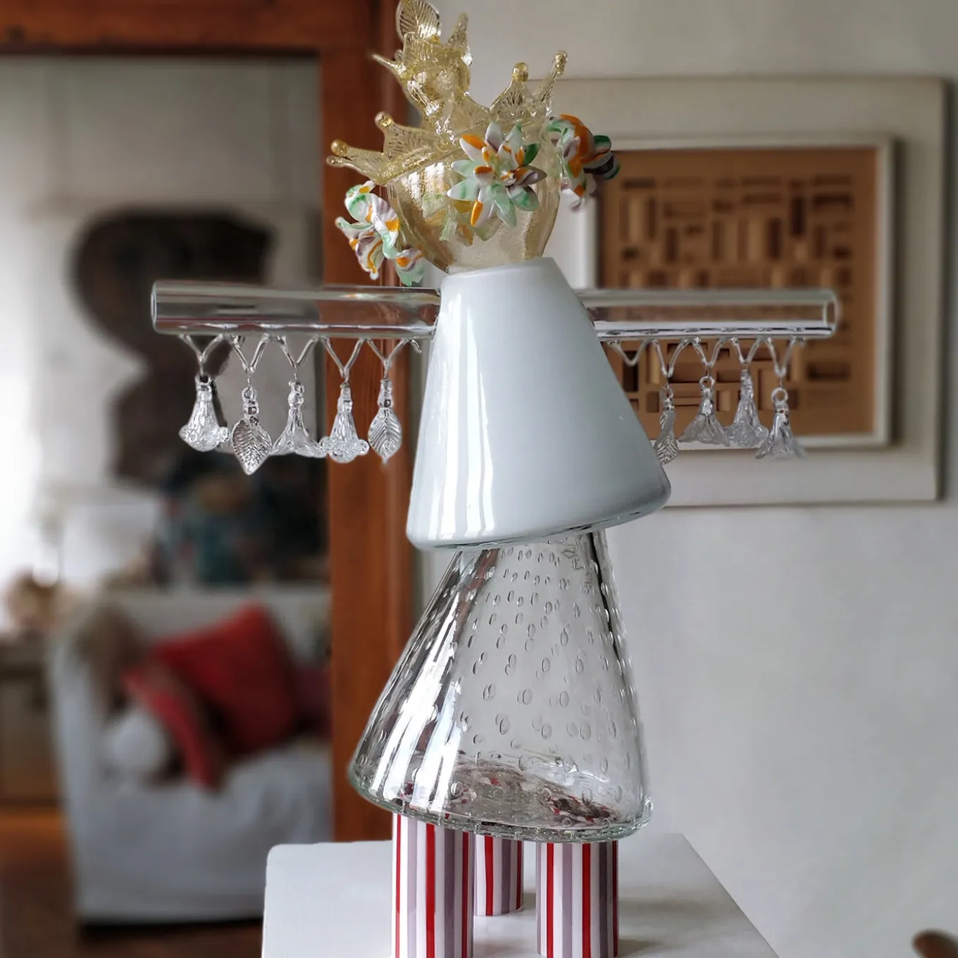 From a limited series of twelve pieces, Rezzonica Granda is inspired by innovative eighteenth century chandeliers, translating the stylings into an imposing contemporary shape. With a body featuring baloton air trapping, the piece sits on three columns in white, red and mauve. The arms are accented with flowers and leaves while the head is crowned with Torcelo-style flowers with gold leaf.