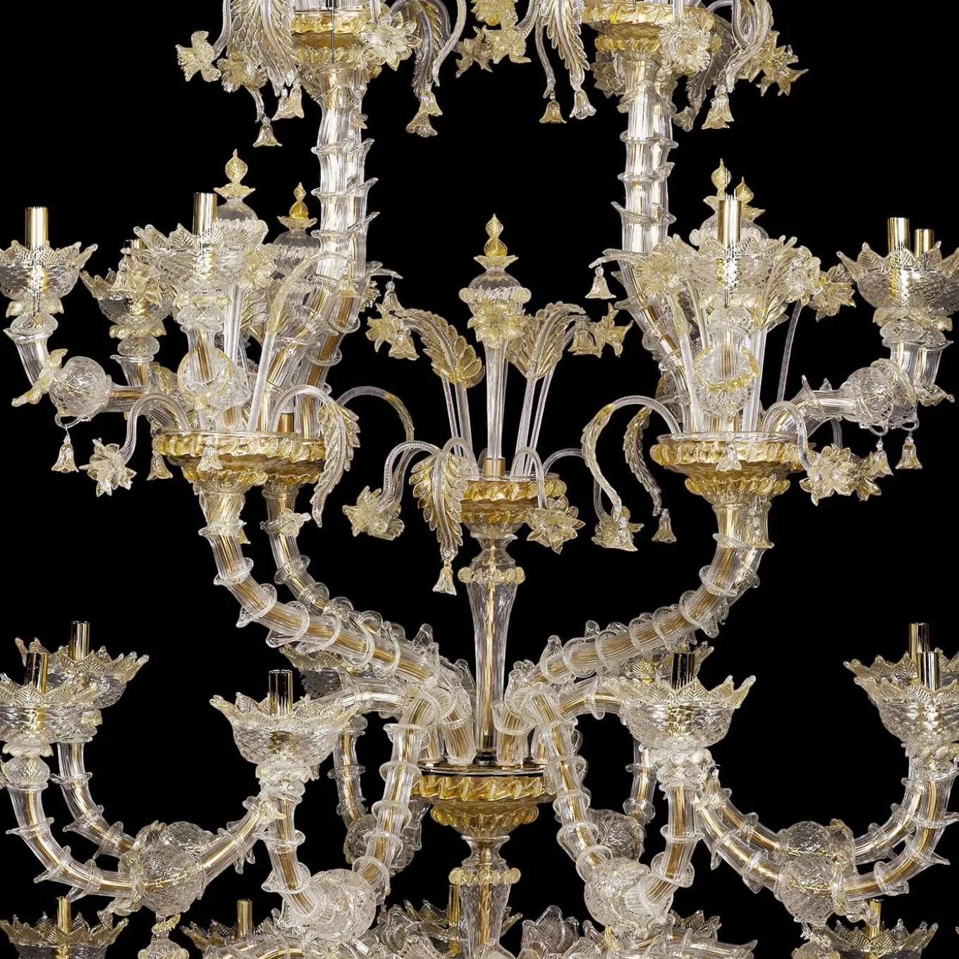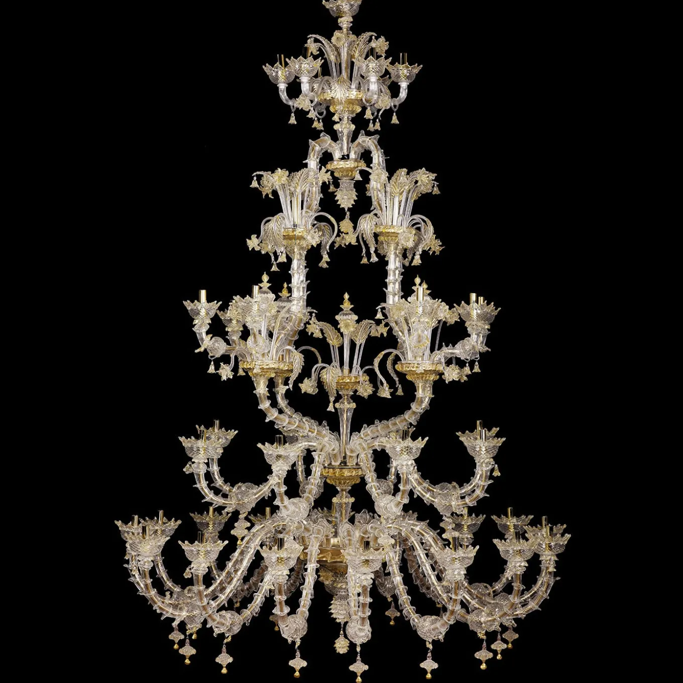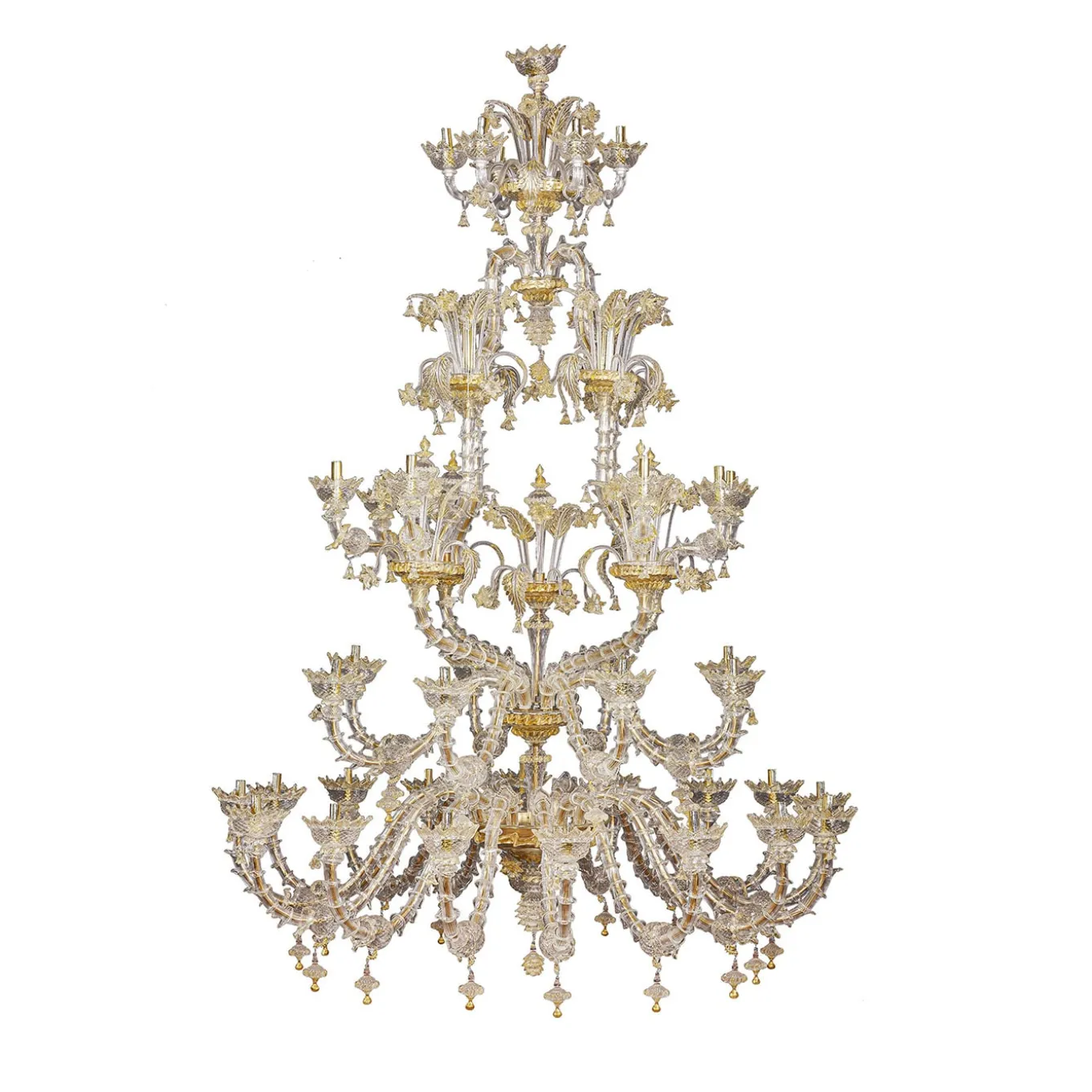 A lavish and precious, stately accent piece for a refined interior setting, this stupendous Rezzonico-style chandelier is comprised of 42 E14 lights arranged on a four-level metal frame. Deftly handcrafted by expert artisans of mouth-blown Murano glass following ancient techniques such as the rigadin, which creates lengthwise textured striping on the glass, it is decorated with crystal and golden details including leaves, flowers, cups, and curls. Suitable for LED lightbulbs.